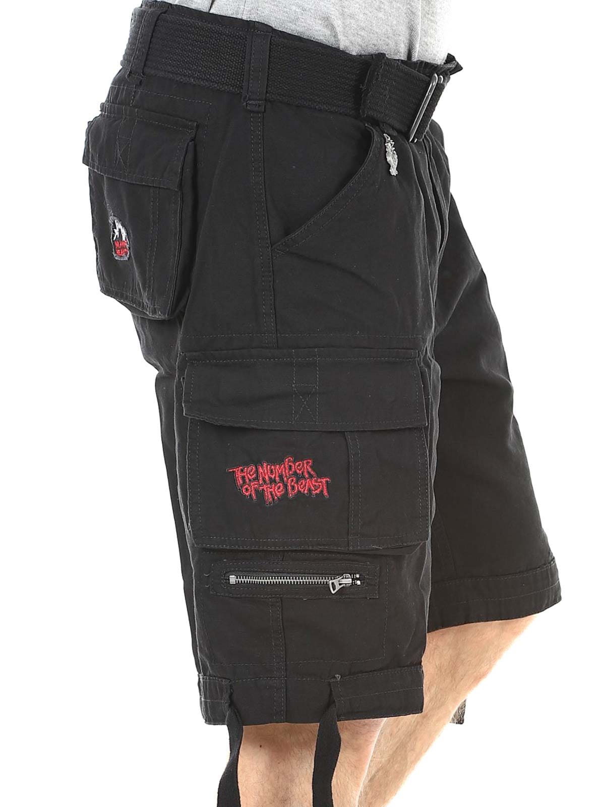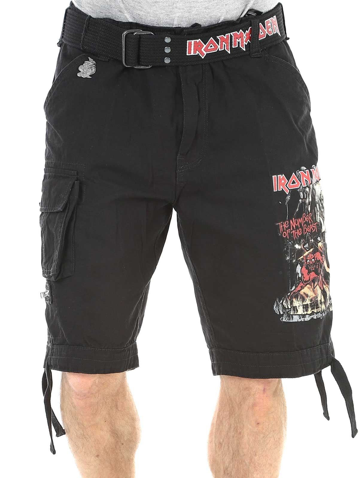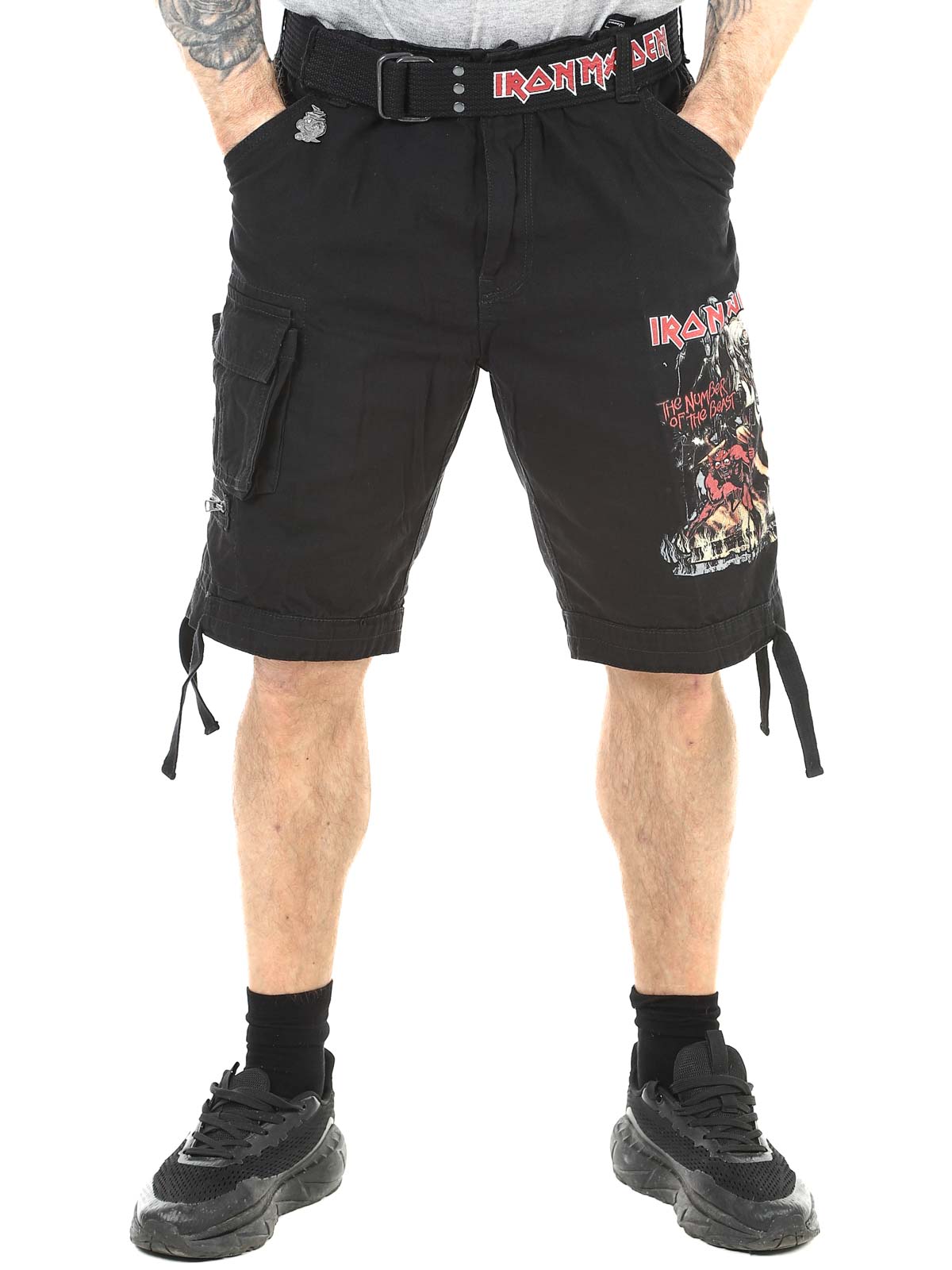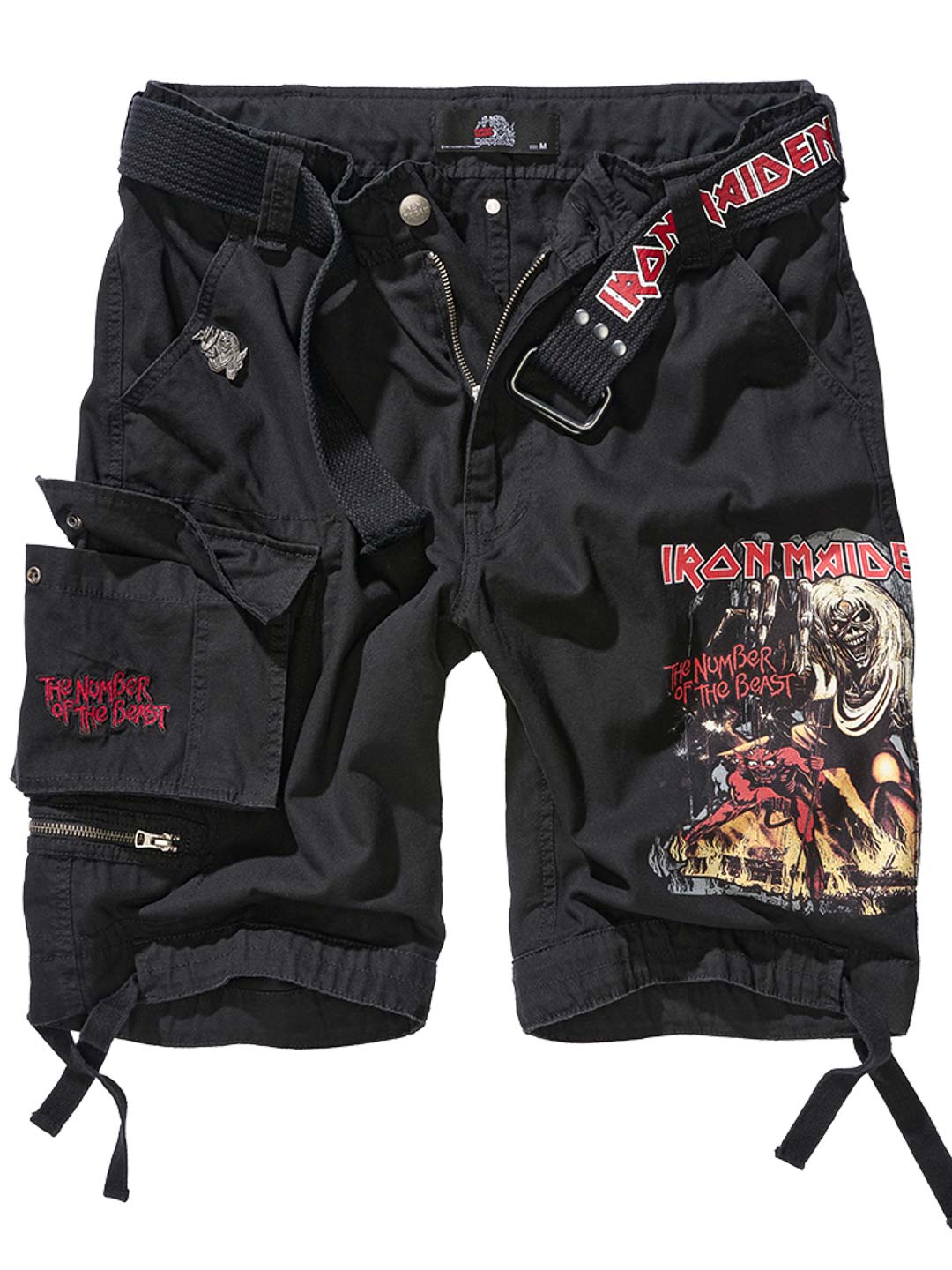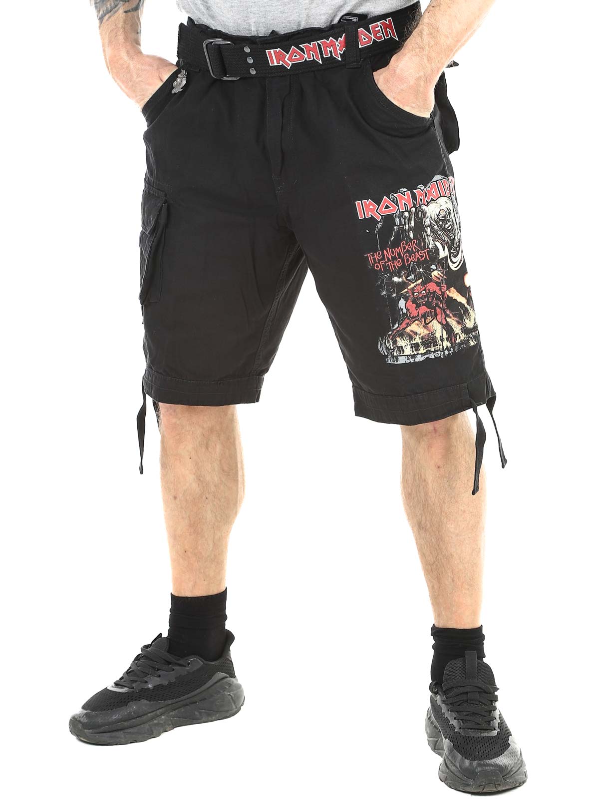 Wytrzymałe szorty cargo dla fanów Iron Maiden i klasycznego stylu rockowego. Szorty łączą solidny, inspirowany stylem militarnym design z kultowymi detalami z albumu "The Number Of The Beast". Wyposażone są w kilka praktycznych kieszeni oraz regulowane paski materiałowe w pasie i przy nogawkach, co ułatwia dopasowanie kroju dla optymalnego komfortu.