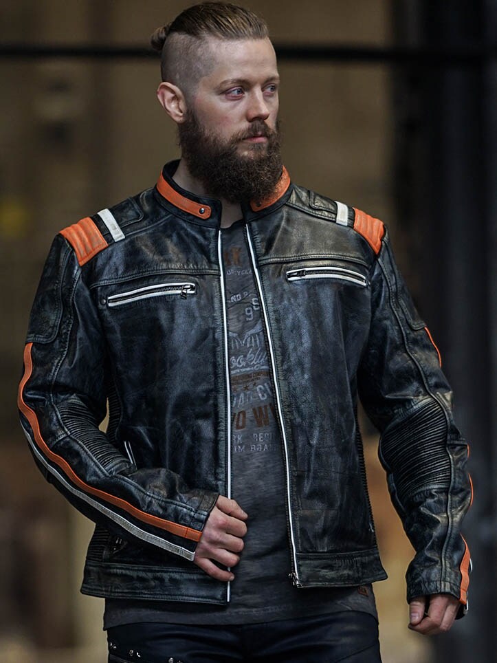 Kurtka w stylu vintage z ciekawymi detalami w postaci biało-pomarańczowych pasków. Posiada cztery zamykane kieszenie z przodu, dwie kieszenie wewnętrzne i niski kołnierz. Ta wyjątkowa skórzana kurtka jest wykonana z wysokiej jakości skóry. Zaprojektowana przez Rockdenim i zainspirowana sportami motorowymi.