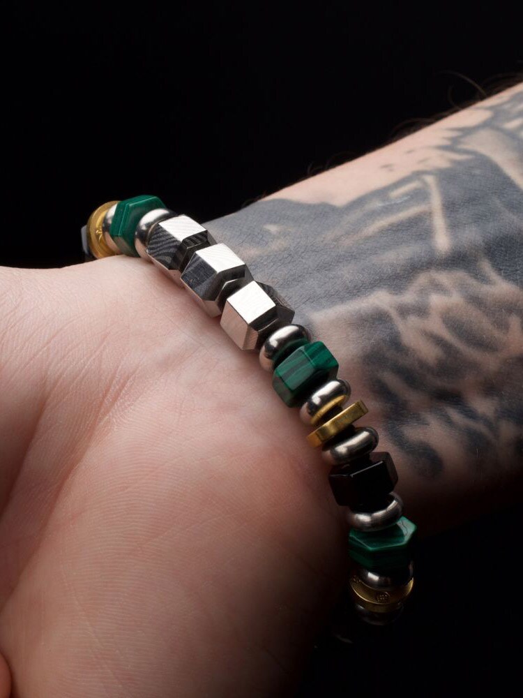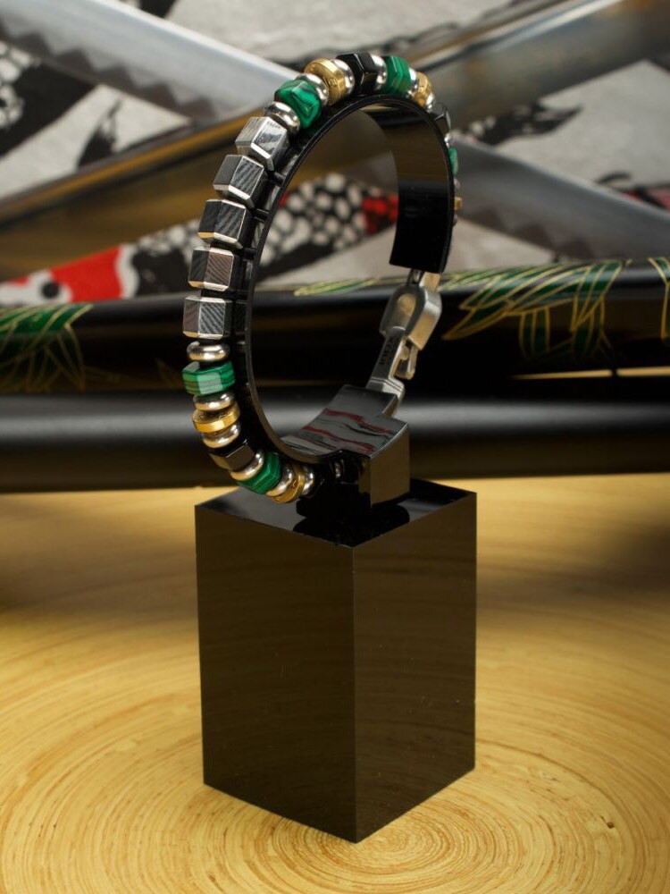 Ekskluzywna bransoletka inspirowana japońską tradycją Bushido. Bransoletka łączy tradycyjną technikę Mokume Gane – unikalną sztukę metalurgii tworzącą wzory przypominające słoje drewna – z pięknymi kamieniami szlachetnymi.