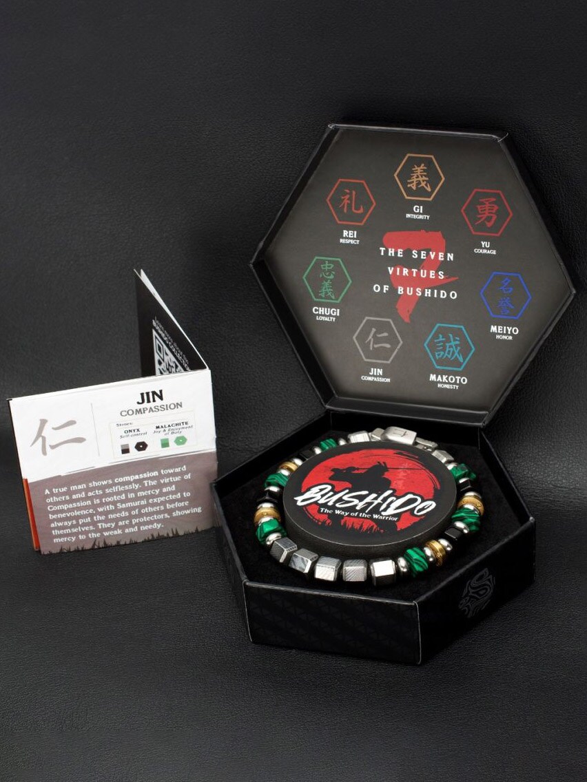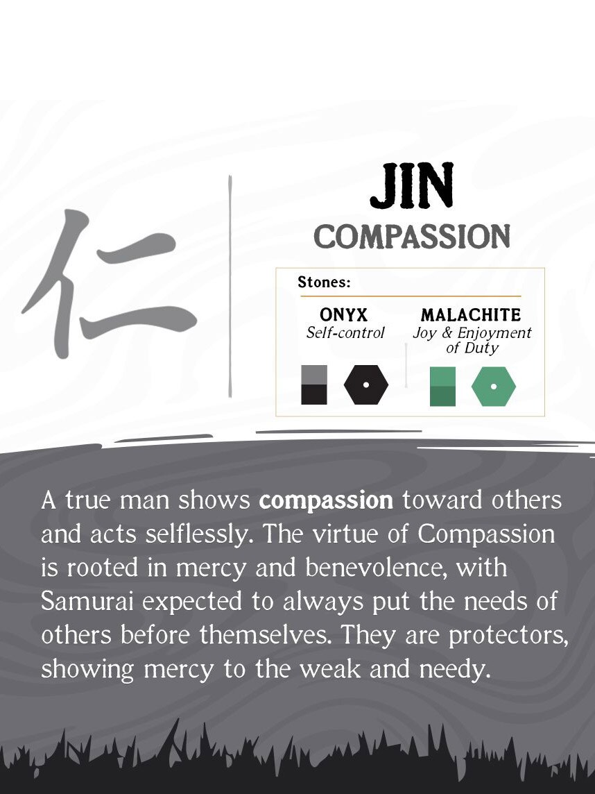 JIN: COMPASSION - Prawdziwy mężczyzna okazuje współczucie innym i działa bezinteresownie. Cnota współczucia zakorzeniona jest w miłosierdziu i życzliwości – od samurajów oczekiwano, że zawsze będą stawiać potrzeby innych ponad własnymi. Są oni obrońcami, okazującymi łaskę słabym i potrzebującym.
