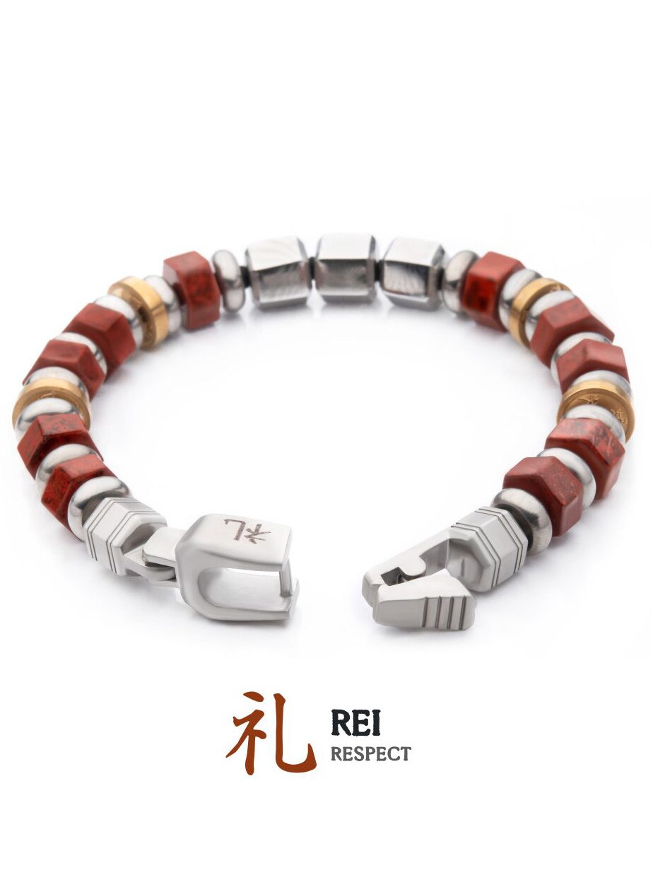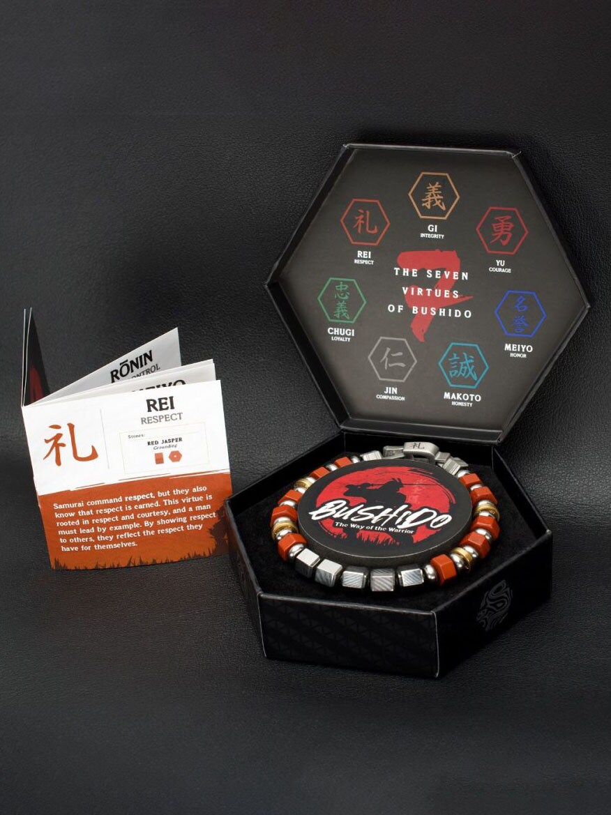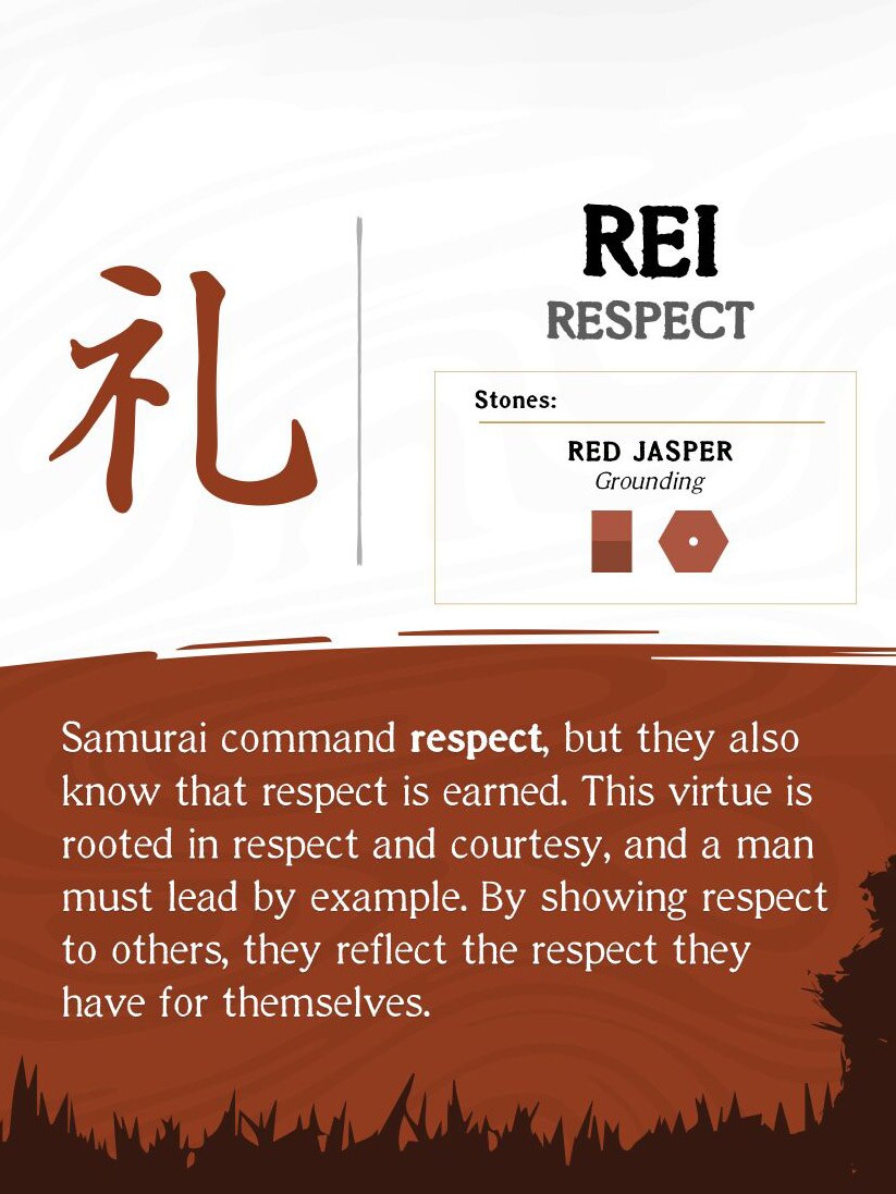 REI: RESPECT - Samuraj budzi szacunek, ale wie również, że szacunek trzeba sobie zasłużyć. Ta cnota zakorzeniona jest w uprzejmości i szacunku, a prawdziwy mężczyzna powinien dawać przykład innym. Okazując szacunek innym, odzwierciedla szacunek, jaki ma do samego siebie.