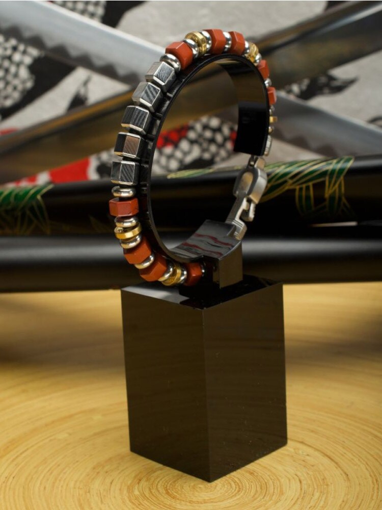 Ekskluzywna bransoletka inspirowana japońską tradycją Bushido. Bransoletka łączy tradycyjną technikę Mokume Gane – unikalną sztukę metalurgii tworzącą wzory przypominające słoje drewna – z pięknymi kamieniami szlachetnymi.