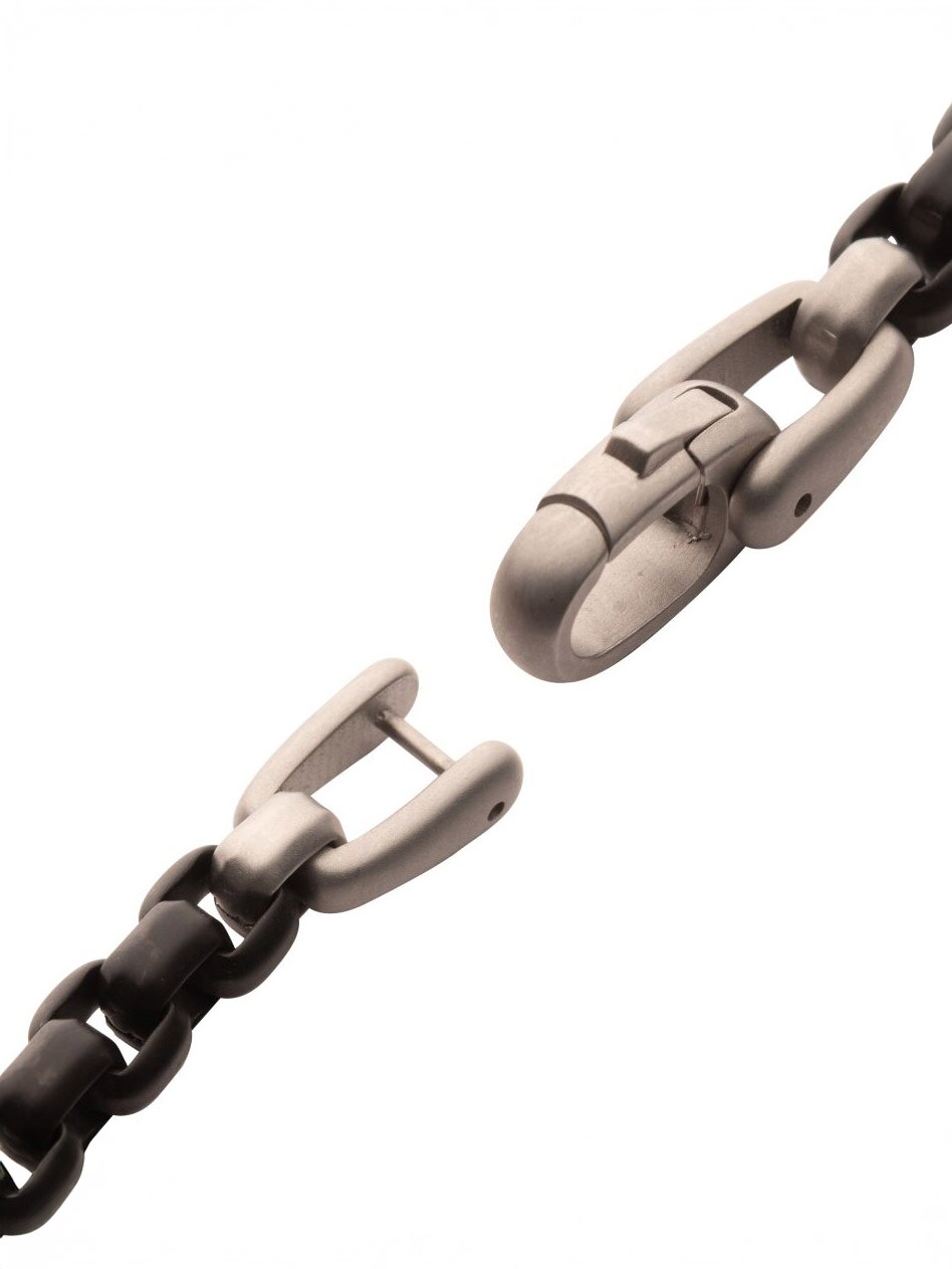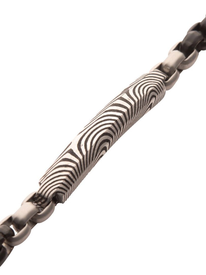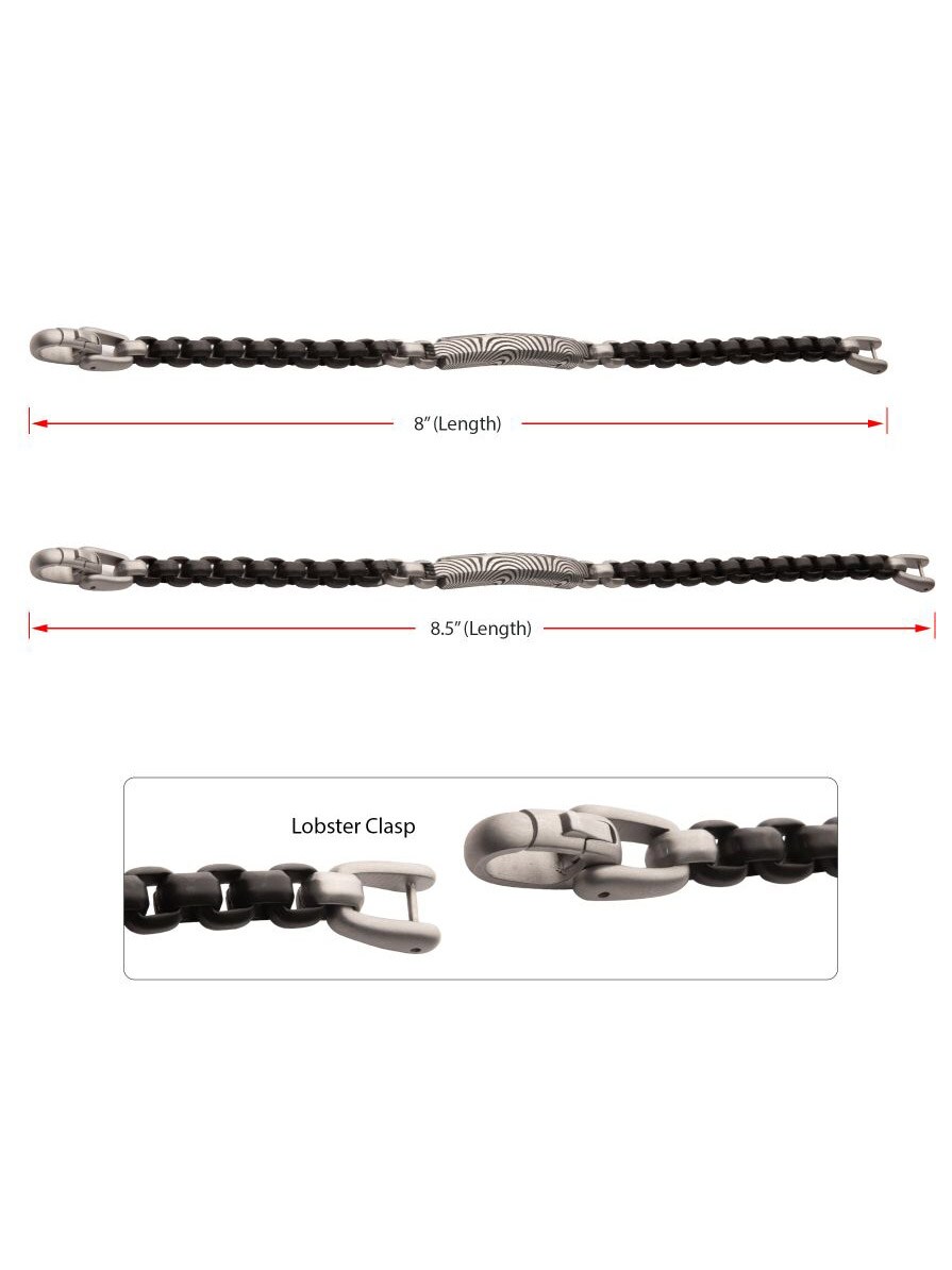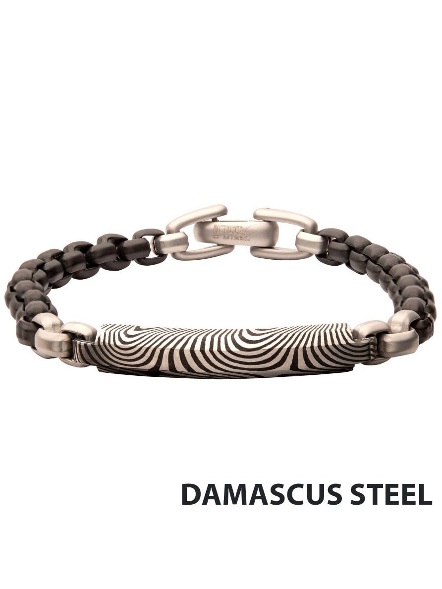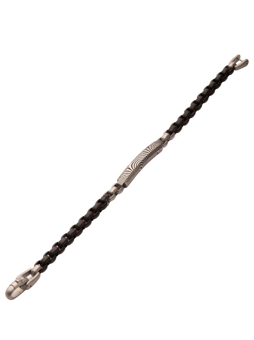 Męska bransoleta z czarnej, IP-powlekanej stali ze splotem typu box chain oraz imponującą płytką z prawdziwej stali damasceńskiej – każda z unikatowym wzorem. Bransoleta wyposażona jest w podwójnie przegubowy karabińczyk, który zapewnia bezpieczne zapięcie i wygodę noszenia.
