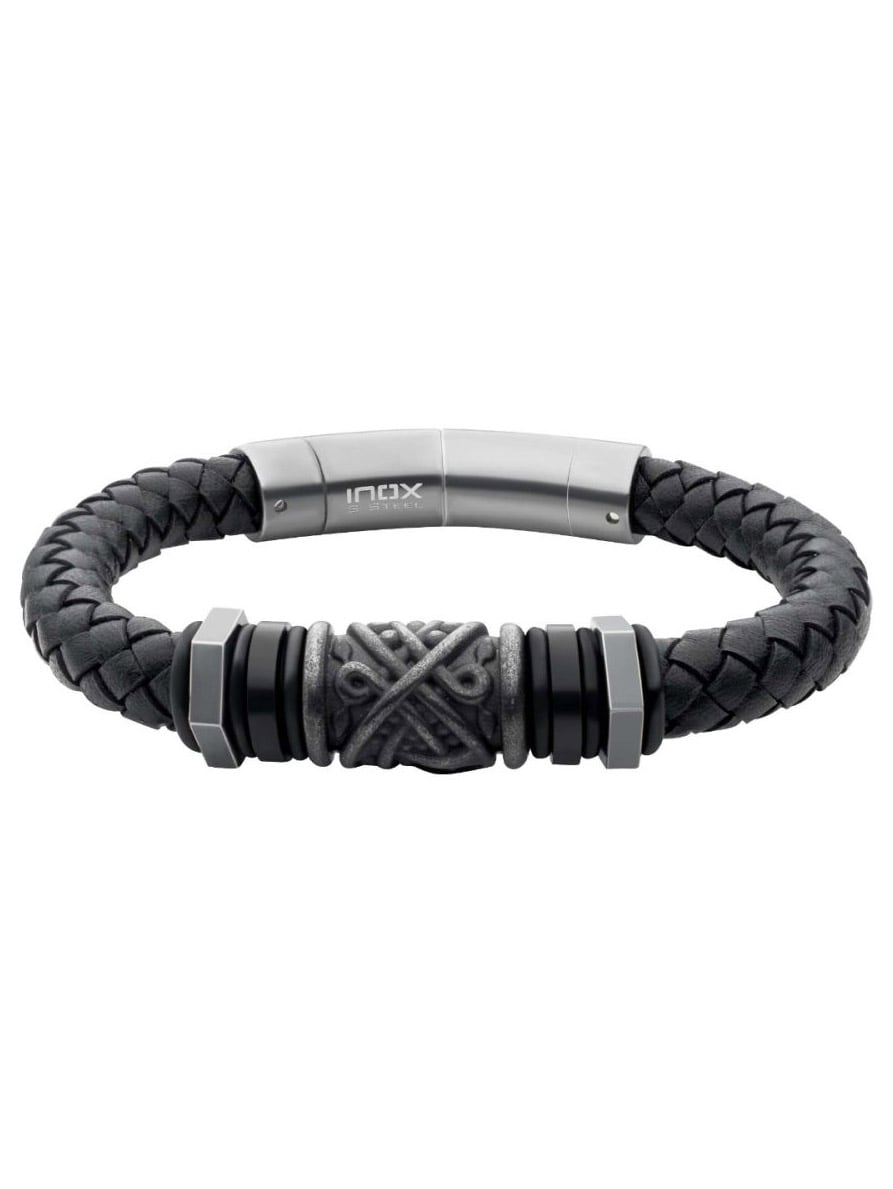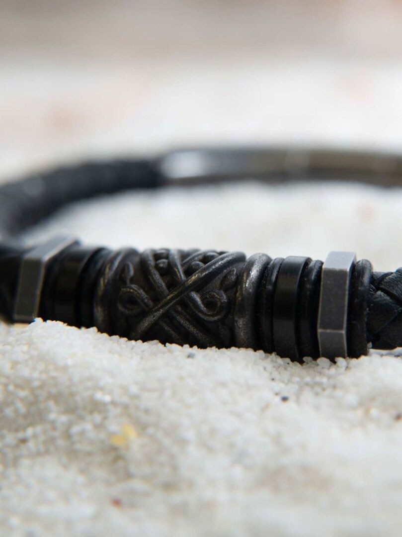 Męska bransoleta z czarnej skóry full grain o plecionym wzorze, z detalami w kolorze gunmetal. Wyposażona w wygodne, cylindryczne zapięcie zaciskowe, które zapewnia łatwe i bezpieczne użytkowanie. Idealny dodatek dla osób chcących nosić coś dyskretnego, lecz wyrazistego.