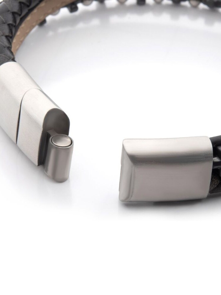 Wielorzędowa bransoleta w kolorze denim, czerni i brązu, wykonana z pełnoziarnistej skóry bydlęcej, połączona z koralikami z hematytu w kształcie małych krzyży. Bransoleta posiada magnetyczne zapięcie ze stali oraz dodatkowe regulowane ogniwo dla idealnego dopasowania. Nowoczesny dodatek o wyjątkowym charakterze i detalach, które przyciągają uwagę.