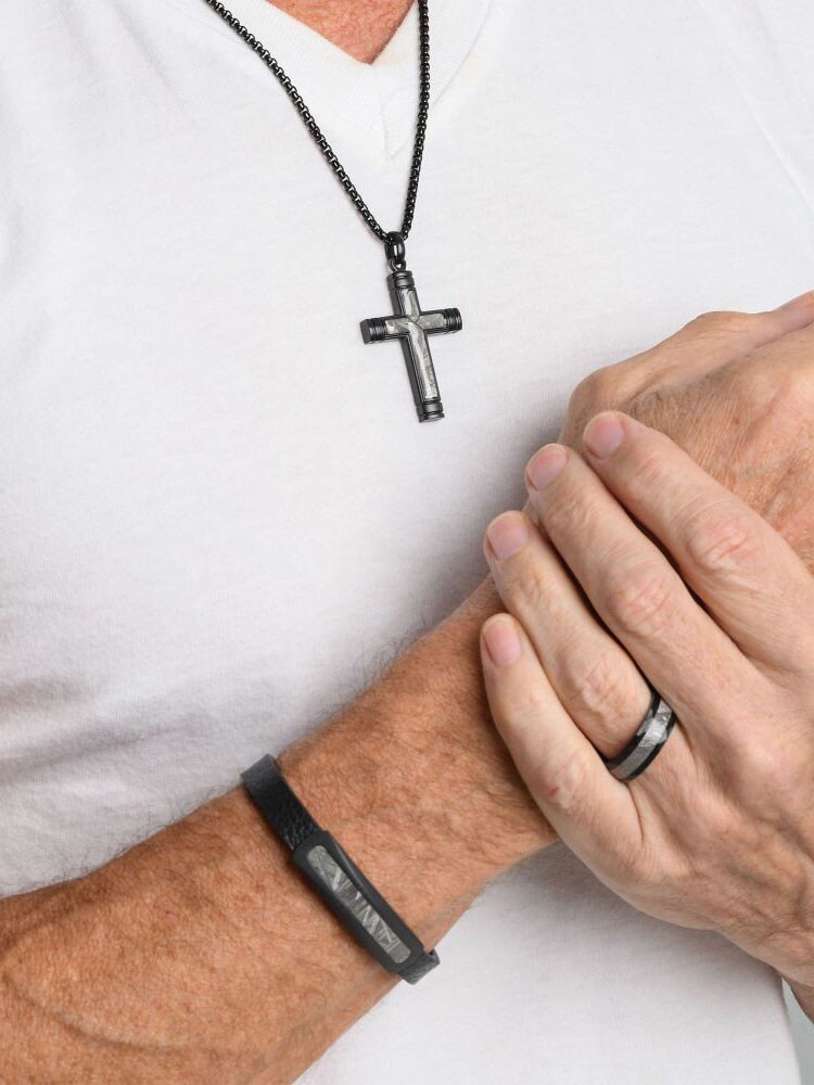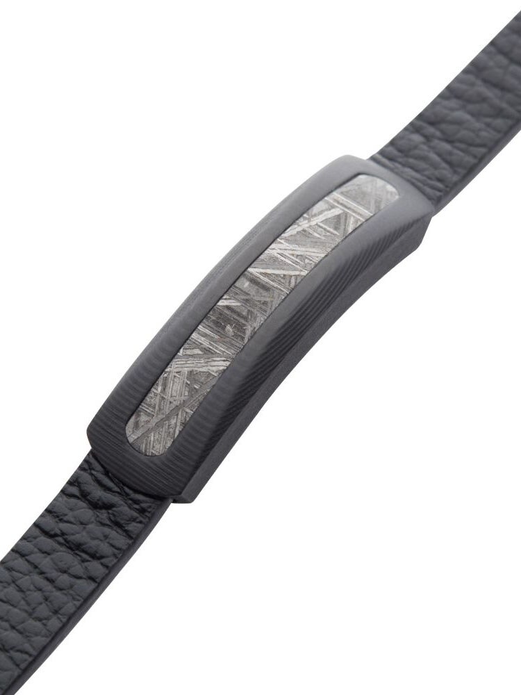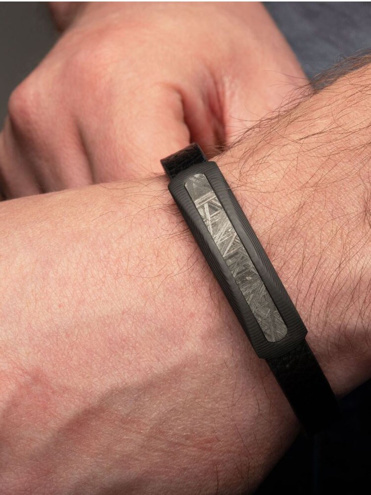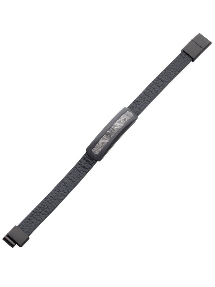 Unikalna bransoletka wykonana z czarnej tłoczonej skóry z ekskluzywnymi detalami z włókna węglowego i autentyczną wstawką z meteorytu. Wyposażona w regulowane magnetyczne zapięcie ze stali nierdzewnej, które zapewnia wygodę i bezpieczeństwo.