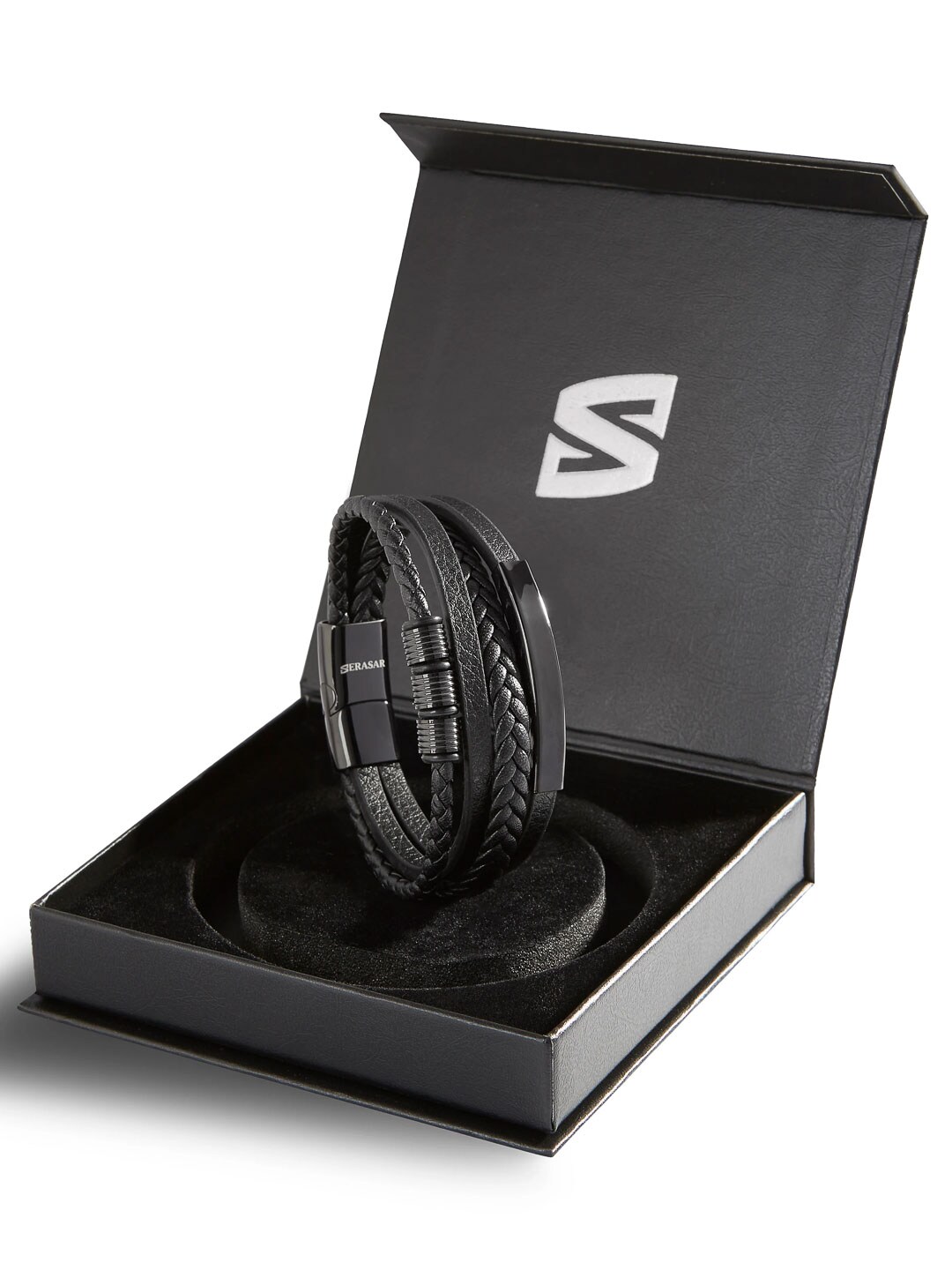 Elegancka bransoletka łącząca czarną, naturalną skórę z polerowanymi elementami ze stali nierdzewnej. Bezpieczne magnetyczne zapięcie ułatwia zakładanie i zdejmowanie, a dołączona przedłużka pozwala dopasować długość do idealnej wygody. Design łączy klasyczną elegancję z nowoczesnym charakterem – idealny na co dzień i na specjalne okazje!