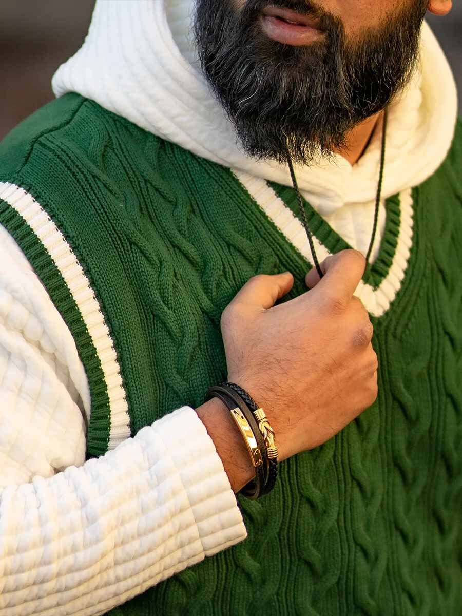 Elegancka bransoletka łącząca czarną, naturalną skórę z polerowanymi elementami ze stali nierdzewnej. Bezpieczne magnetyczne zapięcie ułatwia zakładanie i zdejmowanie, a dołączona przedłużka pozwala dopasować długość do idealnej wygody. Design łączy klasyczną elegancję z nowoczesnym charakterem – idealny na co dzień i na specjalne okazje!