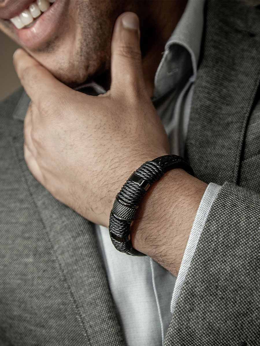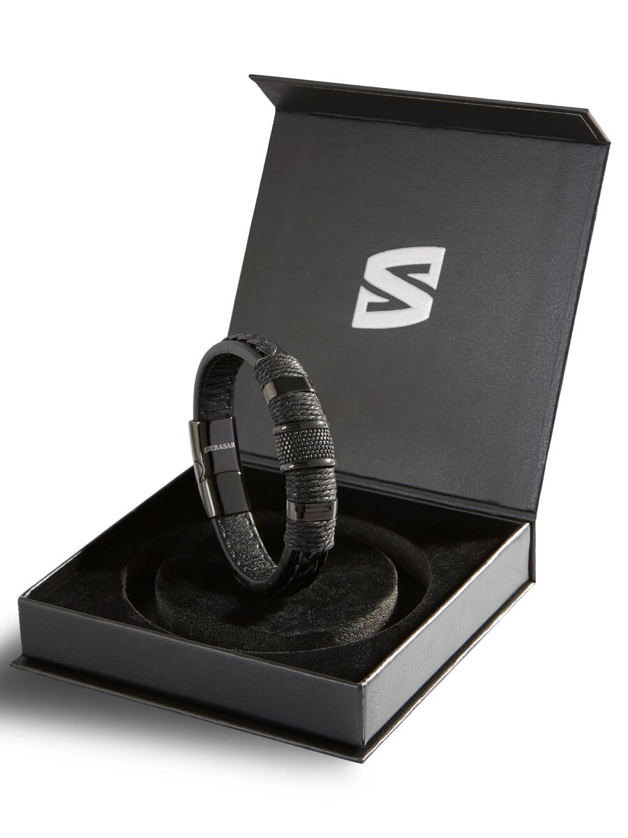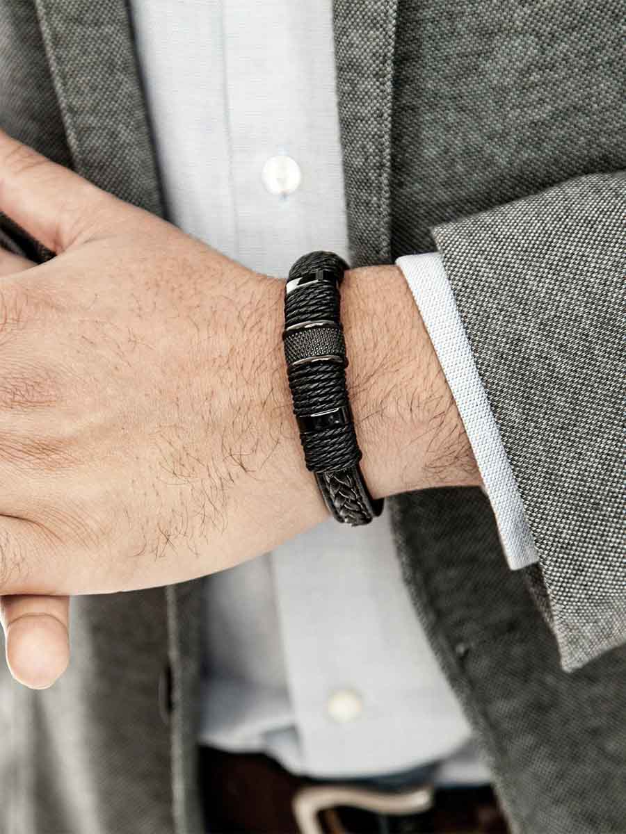 Mocna bransoletka łącząca plecioną skórę z detalami ze stali nierdzewnej, co nadaje jej nowoczesny i solidny wygląd. Zapięcie jest łatwe w obsłudze jedną ręką, a dodatkowe przedłużenie umożliwia dopasowanie długości do własnych preferencji. Stylowy dodatek, który podnosi charakter każdej stylizacji.