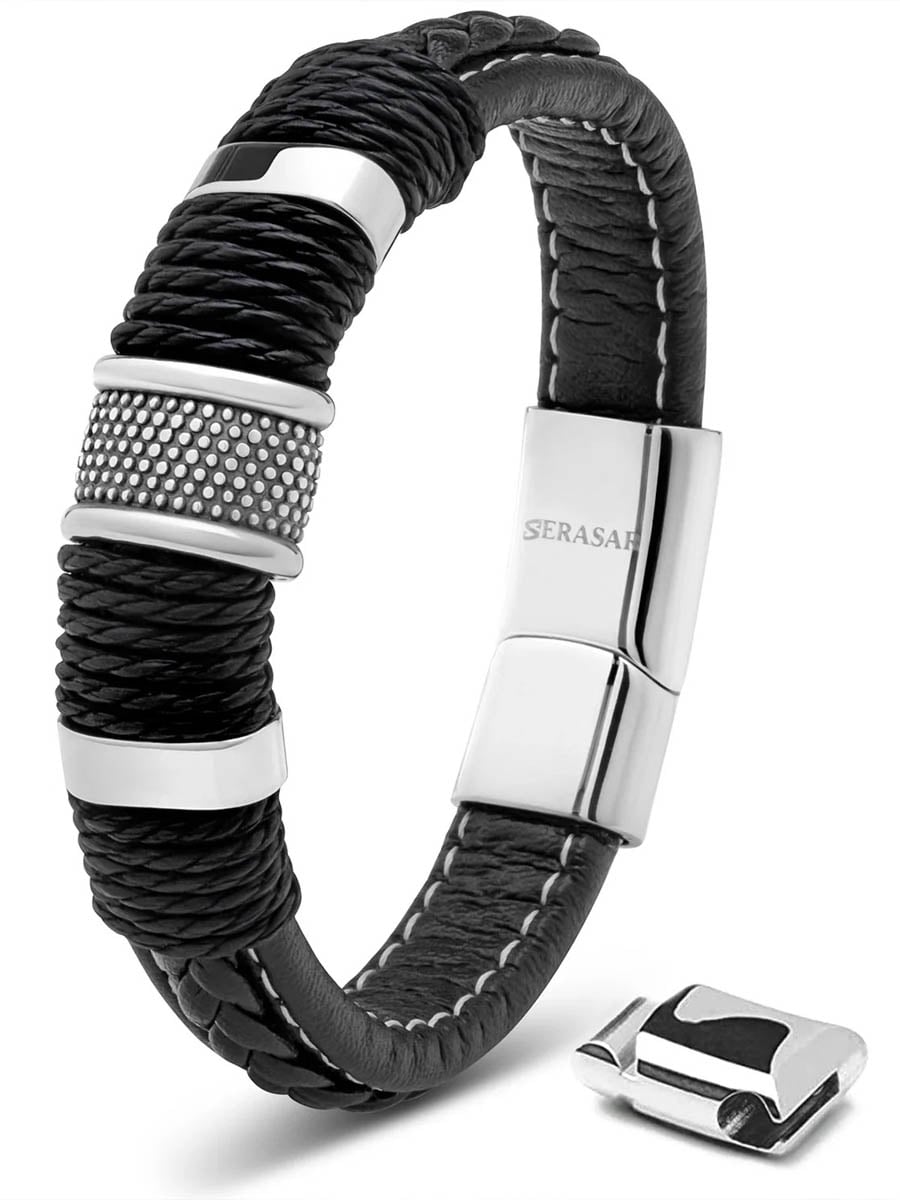 Mocna bransoletka łącząca plecioną skórę z detalami ze stali nierdzewnej, co nadaje jej nowoczesny i solidny wygląd. Zapięcie jest łatwe w obsłudze jedną ręką, a dodatkowe przedłużenie umożliwia dopasowanie długości do własnych preferencji. Stylowy dodatek, który podnosi charakter każdej stylizacji.