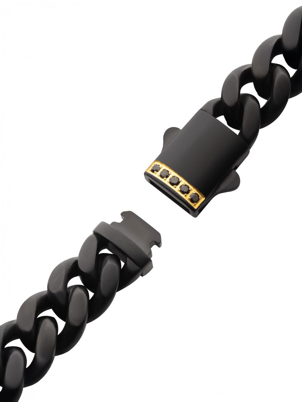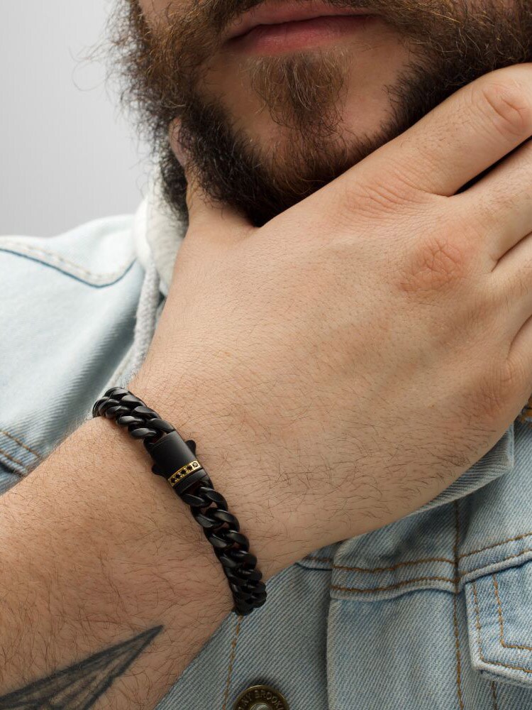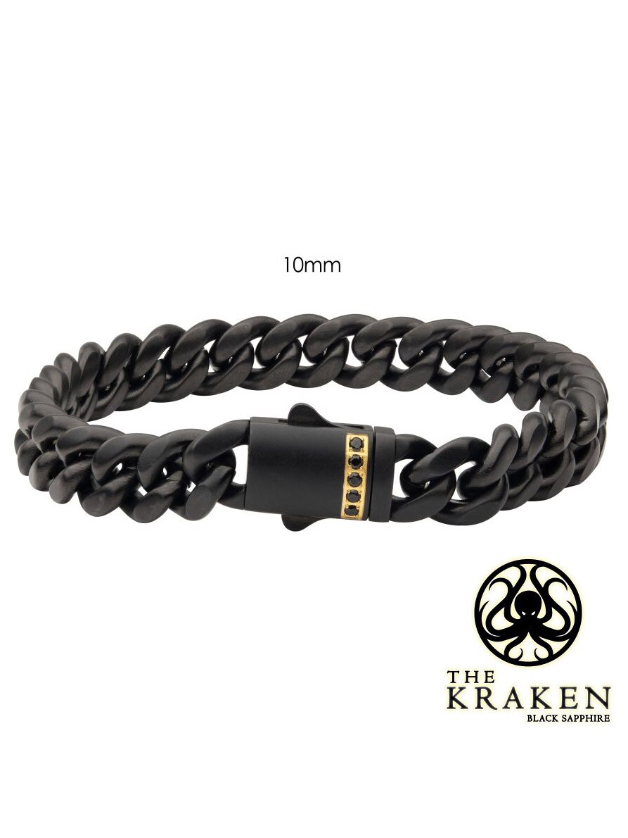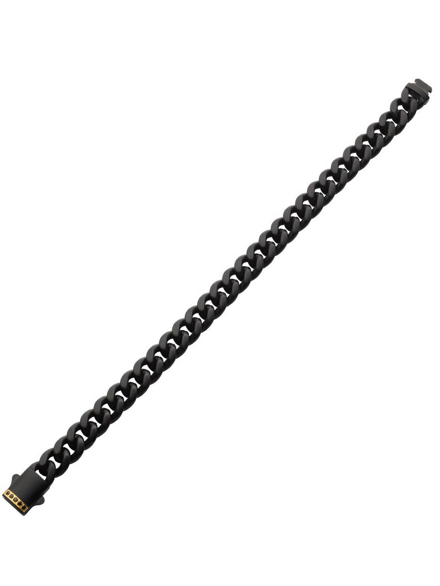 Męska bransoletka z łańcuszkiem typu Miami Cuban o szerokości 10 mm, wykonana ze stali pokrytej czarną powłoką IP o matowym wykończeniu, z podwójnym zapięciem regulowanym i 1 mm prawdziwym czarnym szafirem.