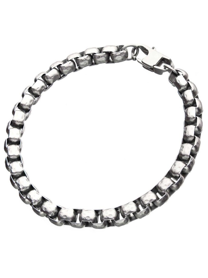 Matowa bransoletka ze stali szlachetnej z grubym łańcuszkiem typu box chain. Młotkowana powierzchnia nadaje bransoletce surowy i industrialny charakter, a zapięcie typu karabińczyk zapewnia bezpieczne i łatwe zapięcie.