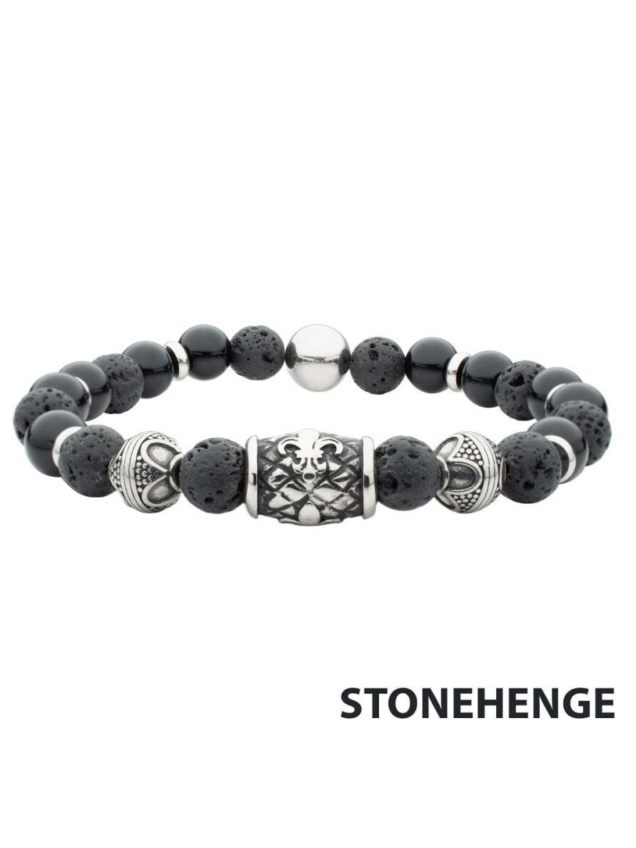 Męska Bransoletka z Czarnym Onyksiem i Kamieniem Lawowym z Koralikiem ze Stali – Motyw Fleur-de-lis