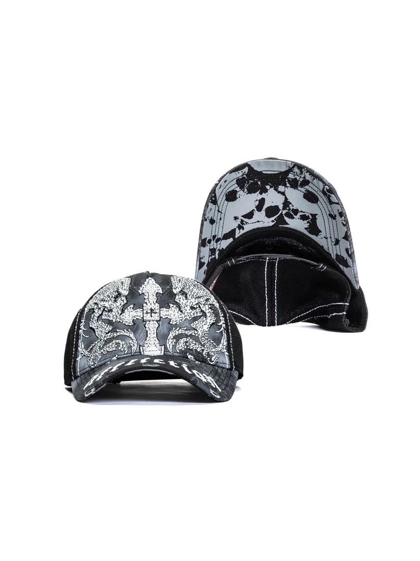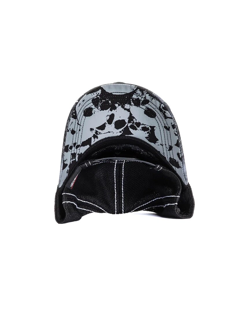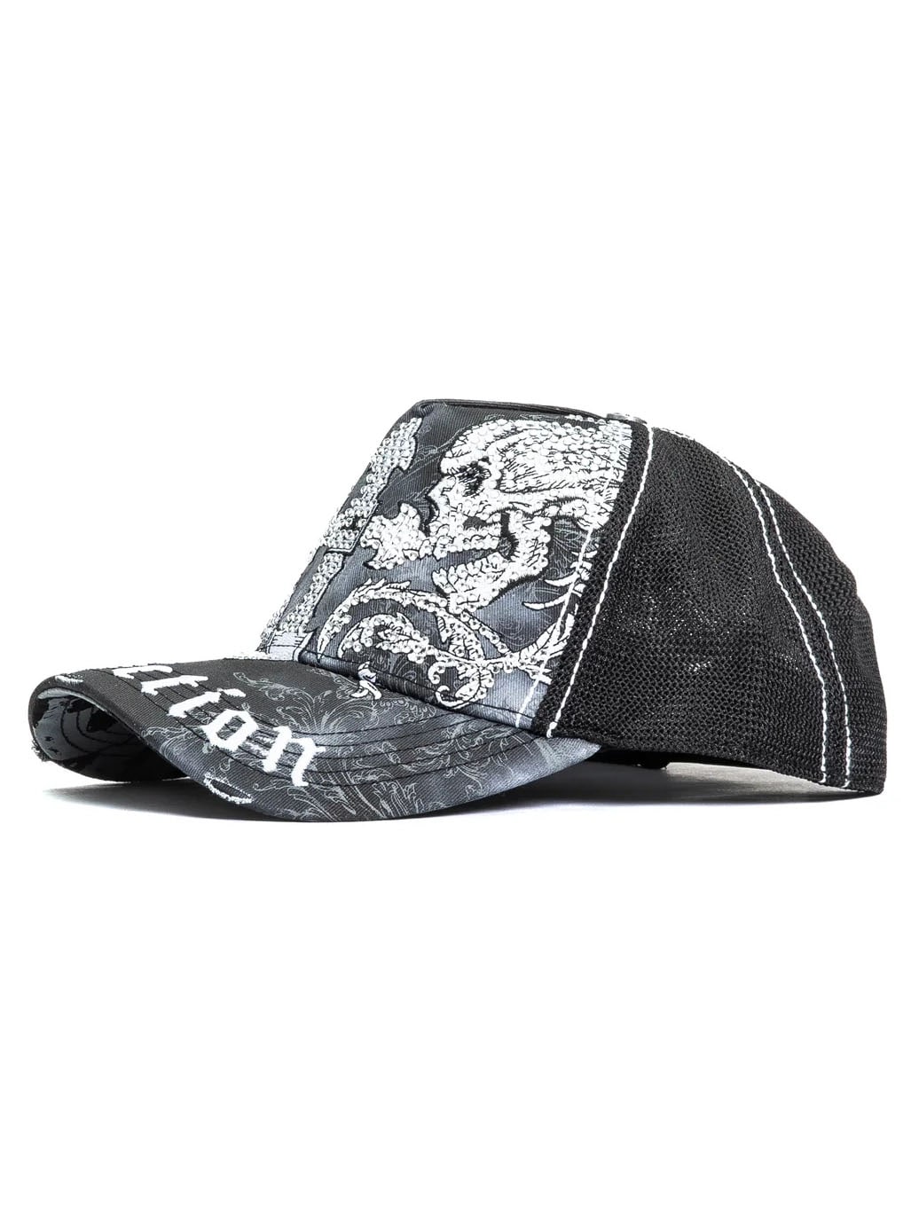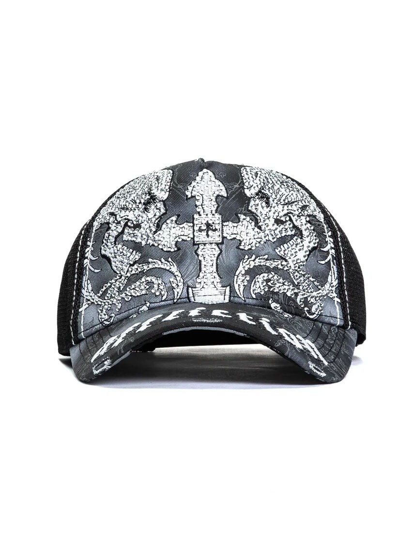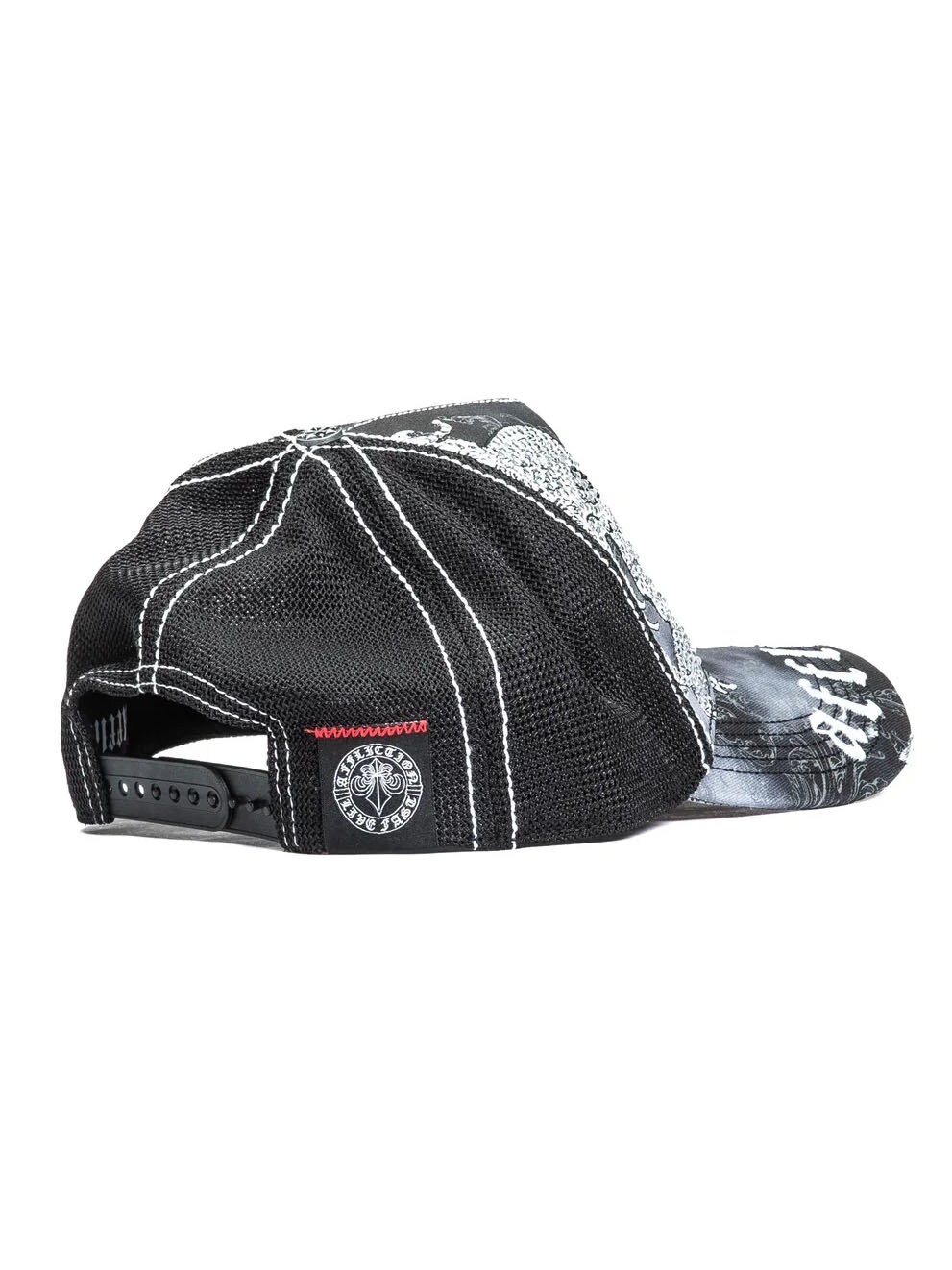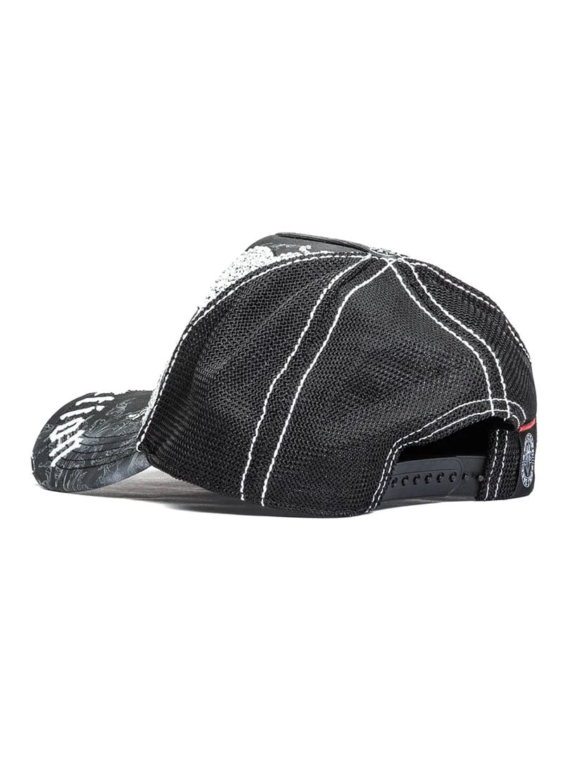 Czarna czapka typu trucker o mocnym i dopracowanym charakterze. Czapka posiada przód i daszek z materiału twill, tył z siateczki oraz zapięcie snapback umożliwiające regulację. Kontrastowe przeszycia nadają całości wykończony wygląd, idealny do streetwearu i codziennego użytku.