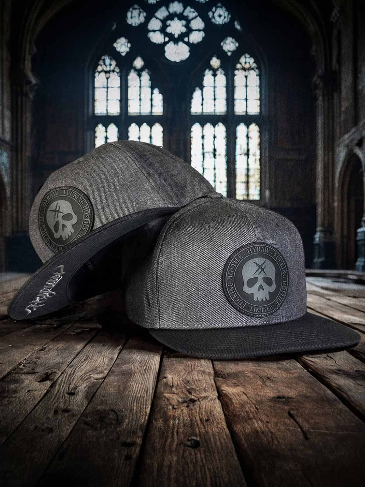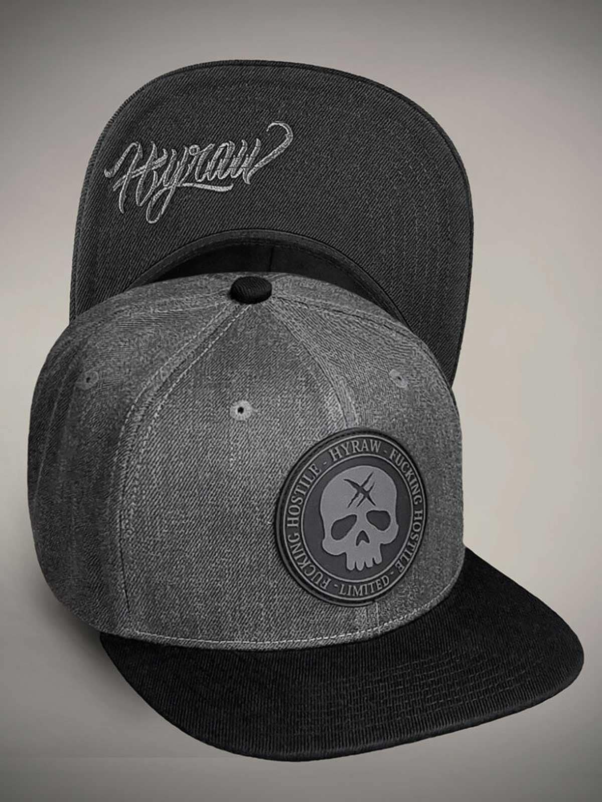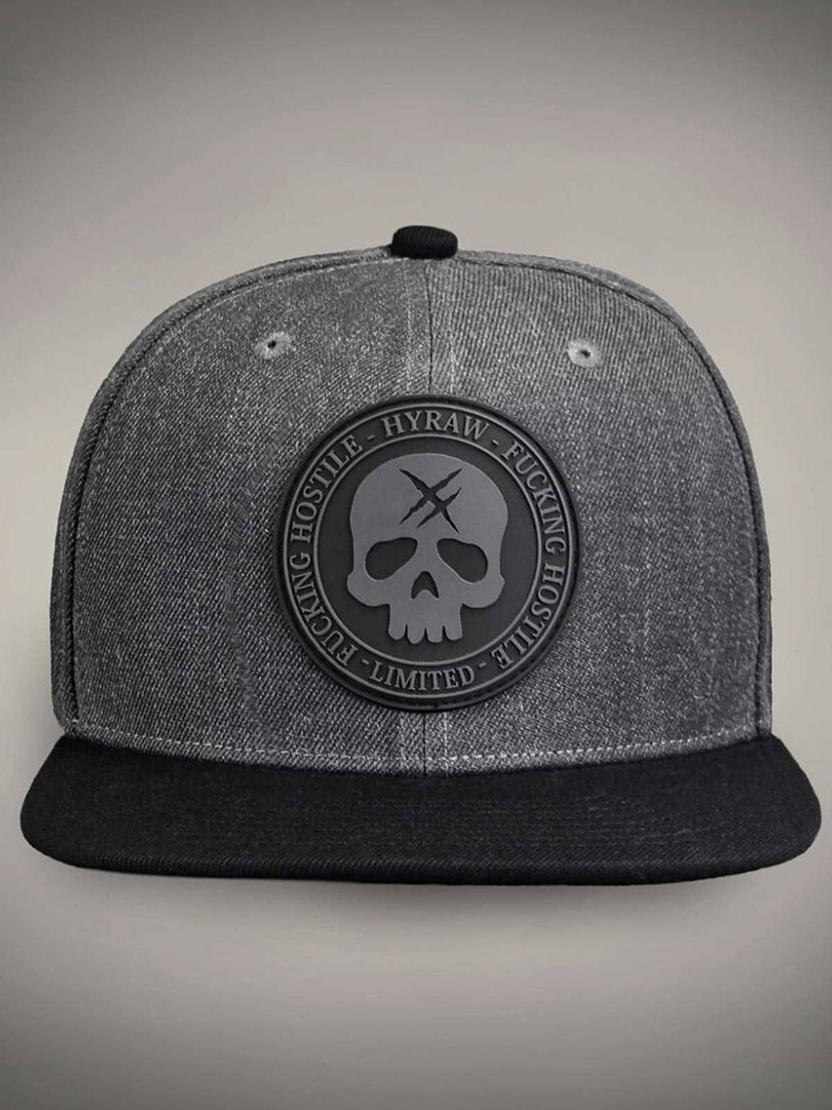 Ciemnoszara czapka z czarnym płaskim daszkiem i gumową naszywką z przodu z motywem czaszki. Czapka ma płaski daszek i regulację snapback.