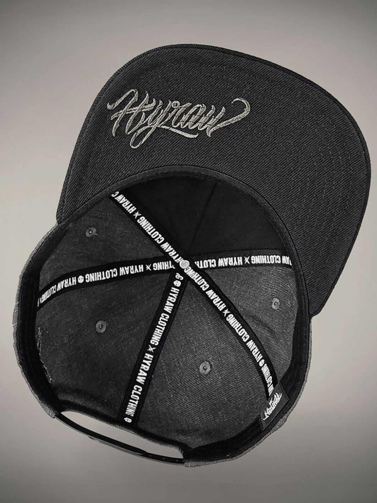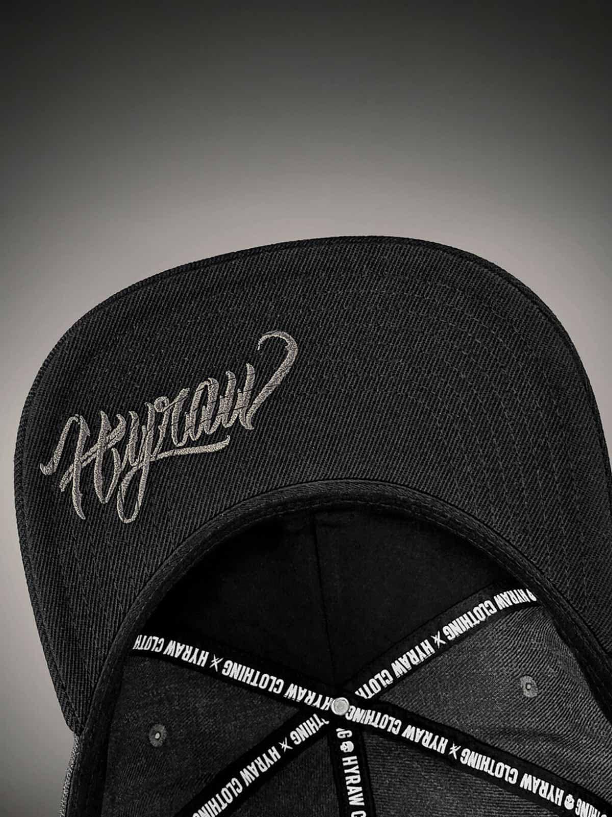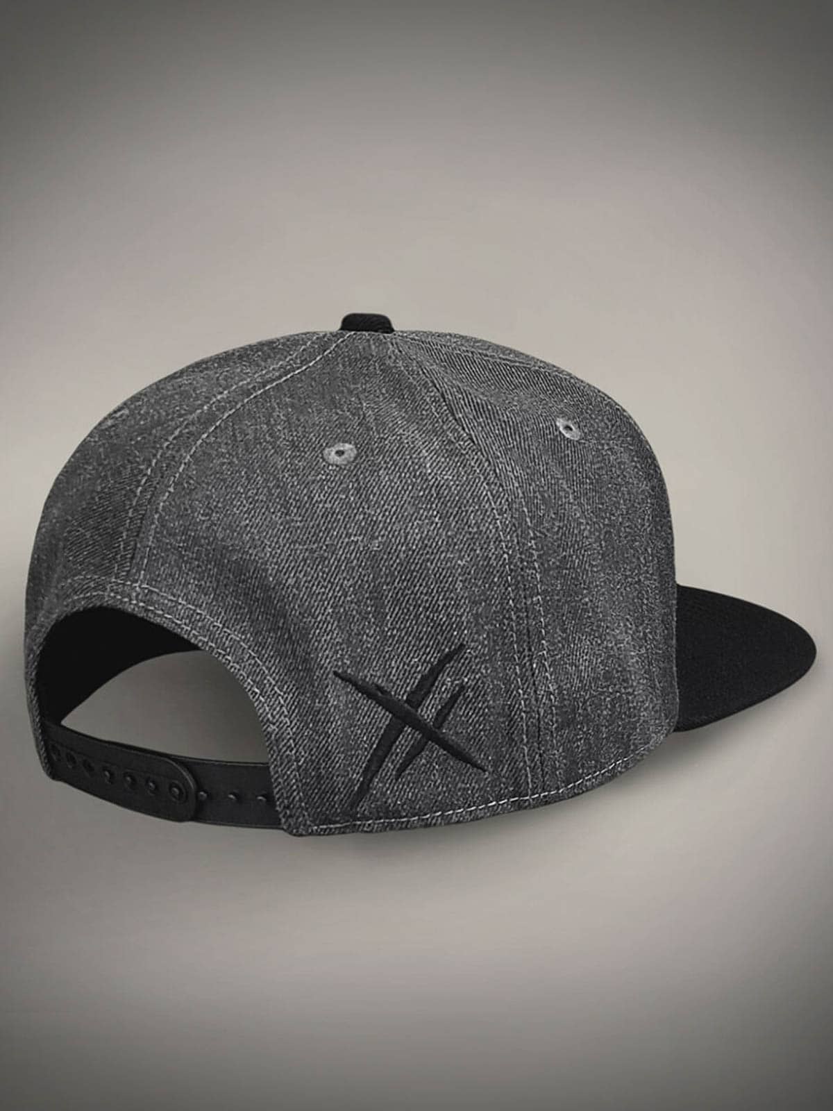 Ciemnoszara czapka z czarnym płaskim daszkiem i gumową naszywką z przodu z motywem czaszki. Czapka ma płaski daszek i regulację snapback.