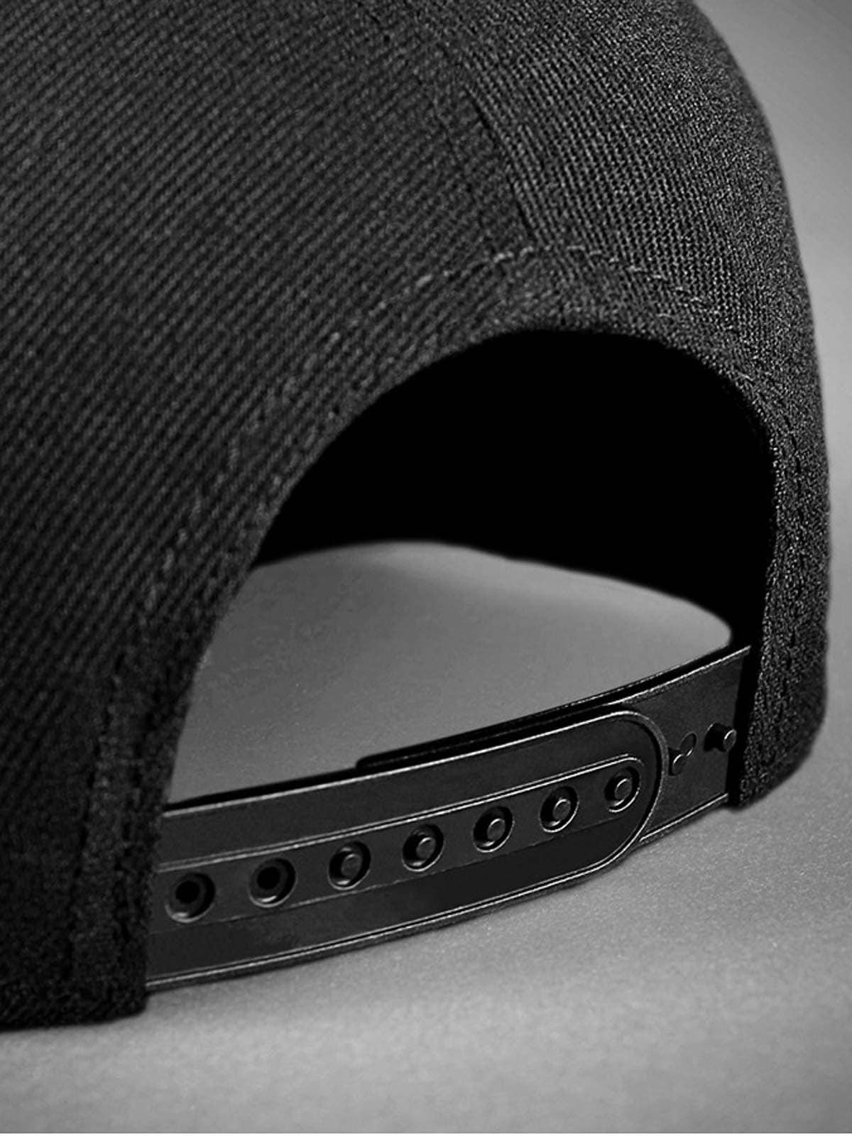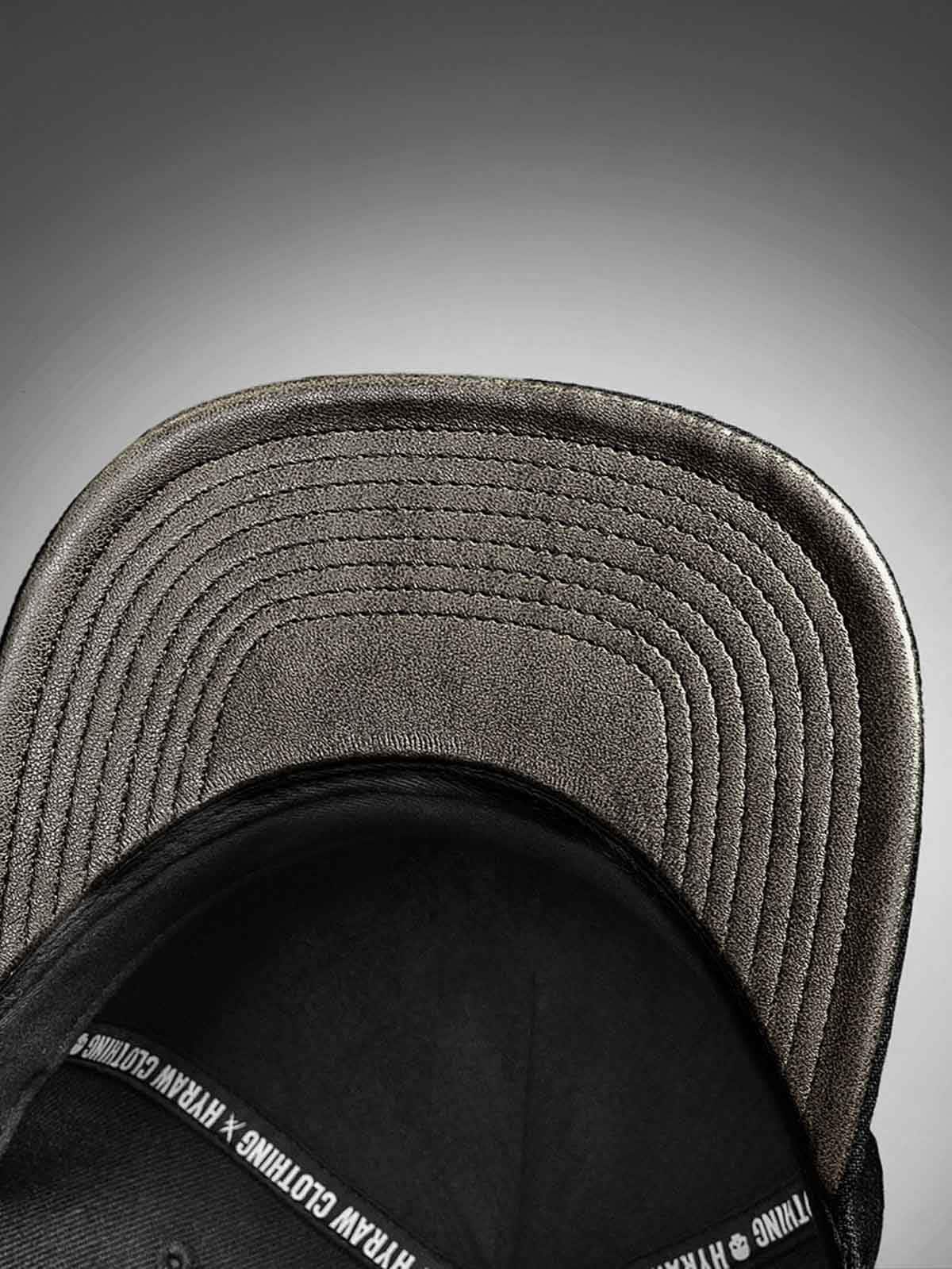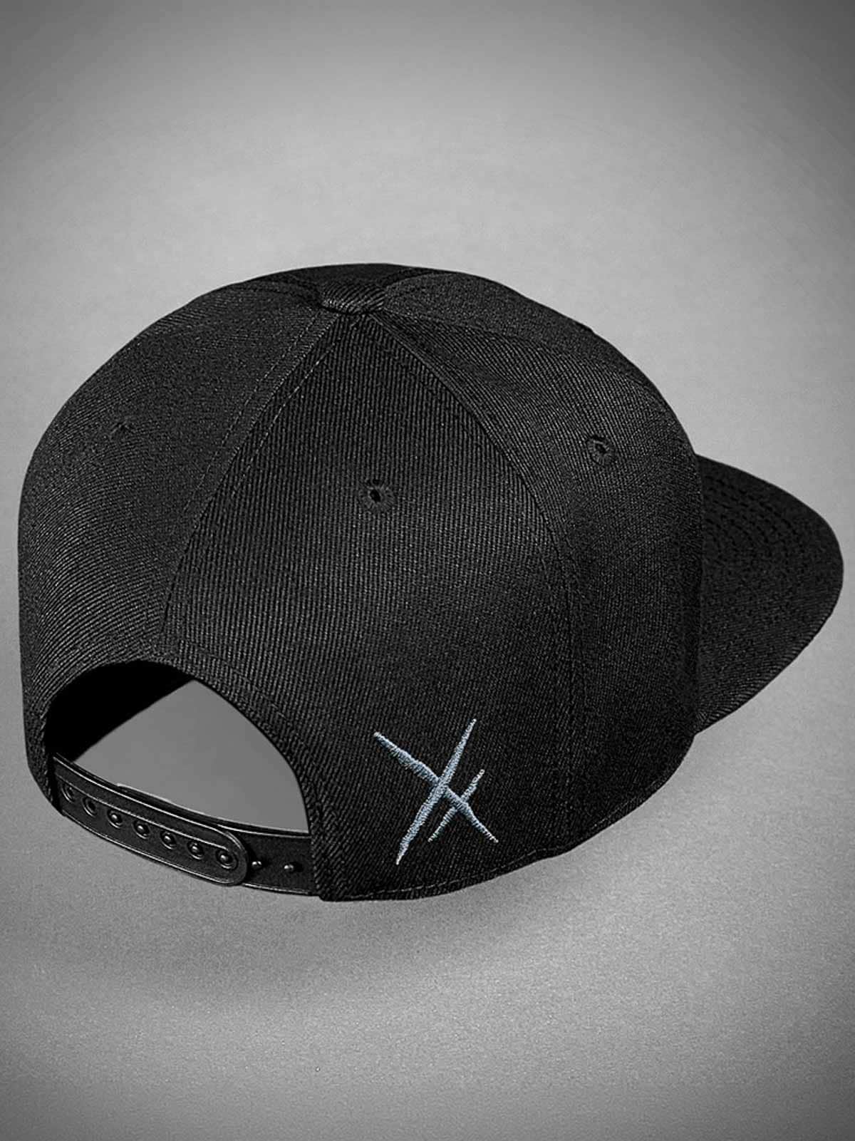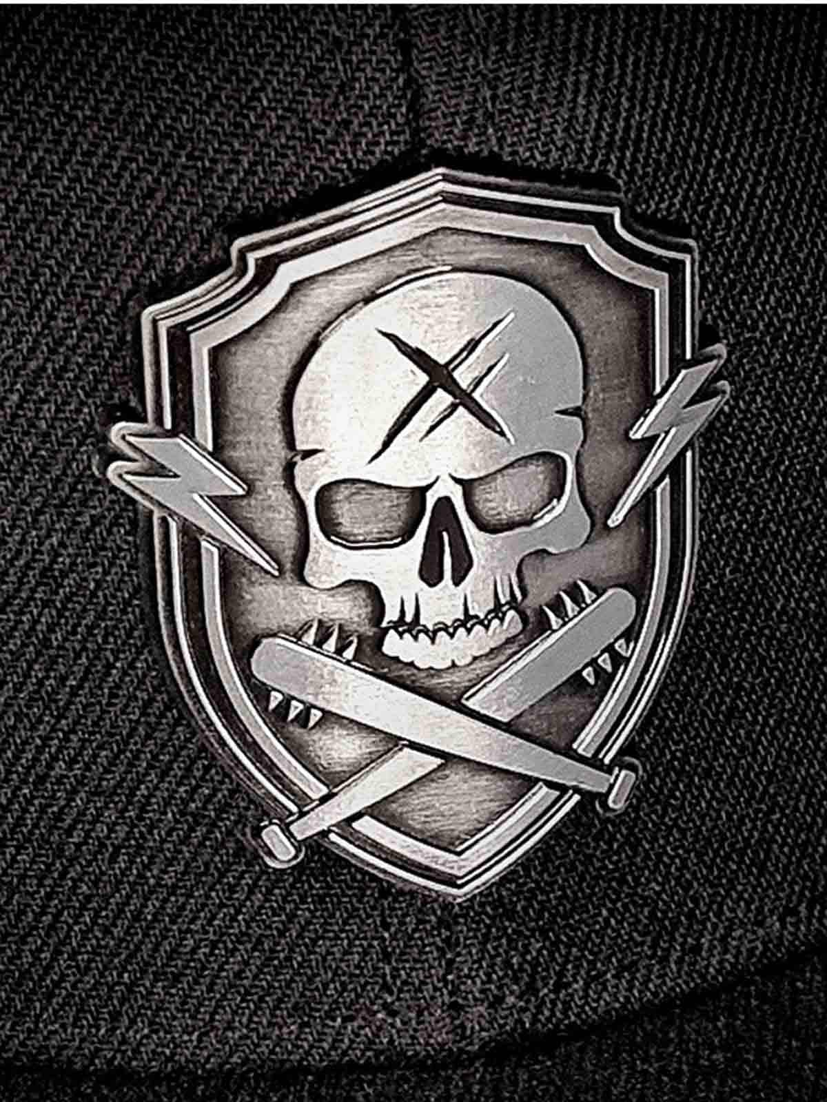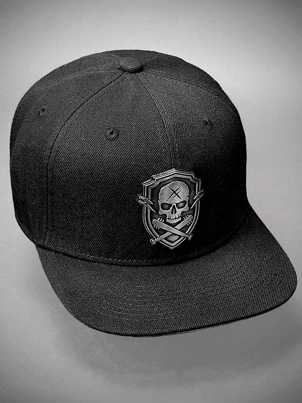 Czarna czapka snapback z płaskim daszkiem. Ozdobiona metalową naszywką z przodu z motywem czaszki. Spód daszka pokryty jest imitacją skóry.