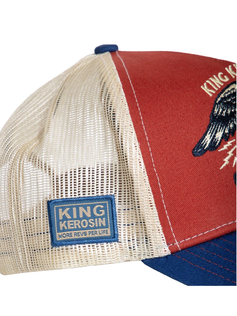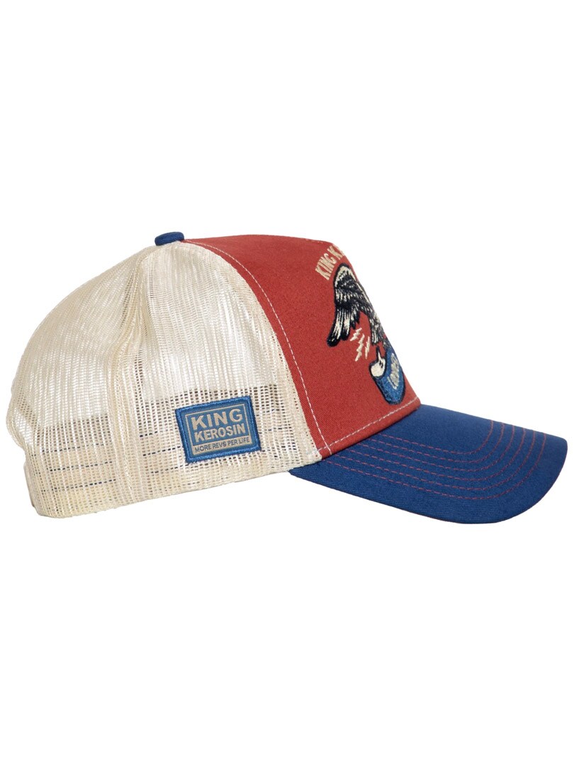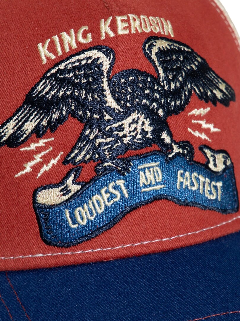 Ta truckerka to statement dla wszystkich, którzy odważą się być widoczni i słyszalni. Niebieski daszek i beżowy materiał mesh tworzą mocny kontrast kolorystyczny, a zapięcie typu snapback zapewnia idealne dopasowanie. Przód zdobi haftowany orzeł z rozpostartymi skrzydłami na czerwonym panelu, wraz z napisem „Loudest and Fastest”, nadając czapce wyraźny charakter.