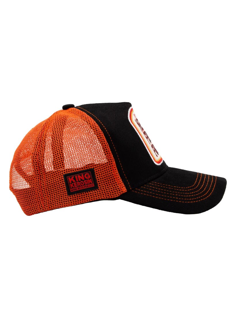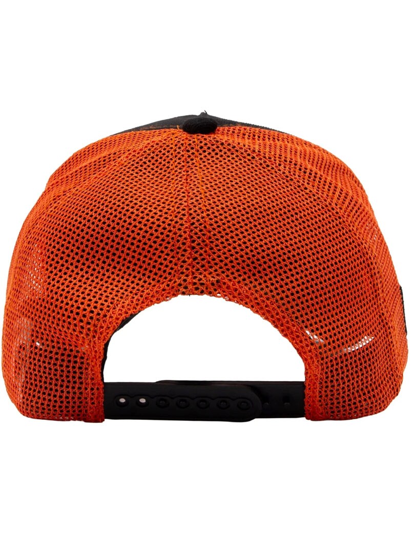 Wyrazista czapka w kolorach czarnym i pomarańczowym z mocnym kontrastem, który przyciąga wzrok, oraz ekspresyjnym designem nadającym charakter od pierwszego spojrzenia. Posiada tylny panel z siateczki zapewniający dobrą wentylację, wyraźne kontrastowe przeszycia oraz regulowane zapięcie typu snapback gwarantujące wygodne dopasowanie przez cały dzień.