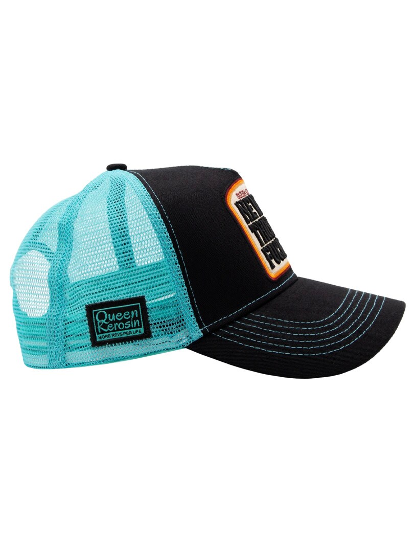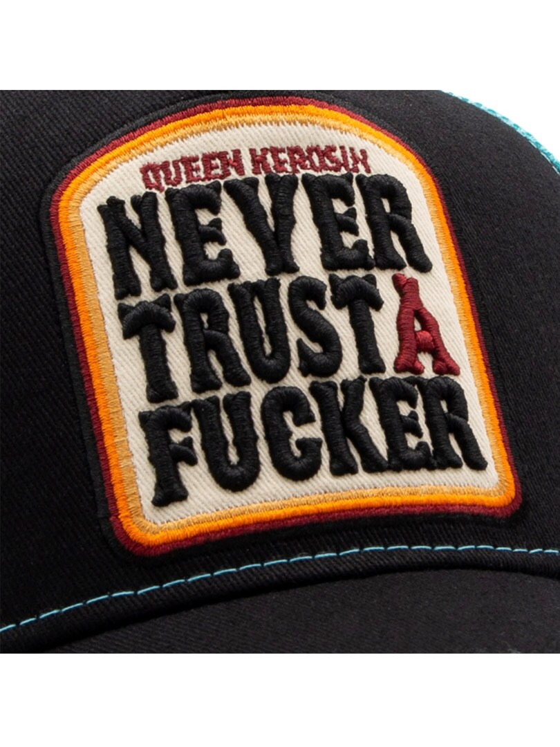 Fajna czapka w czerni i jasnym niebieskim z haftowanym logo z przodu i odważnym napisem „Never Trust a F*cker”. Regulowany snapback zapewnia idealne dopasowanie do każdej głowy. Zabawne połączenie charakteru, humoru i prawdziwego stylu. Czapka ma zakrzywiony daszek i przewiewny tył z siateczki, co daje styl i dobrą wentylację.