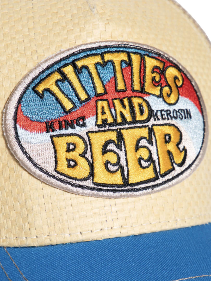 Wyrazista czapka w kilku kolorach, zaprojektowana z napisem „Titties and Beer”. Posiada zakrzywiony daszek, siateczkę z tyłu oraz zapięcie typu snapback.
