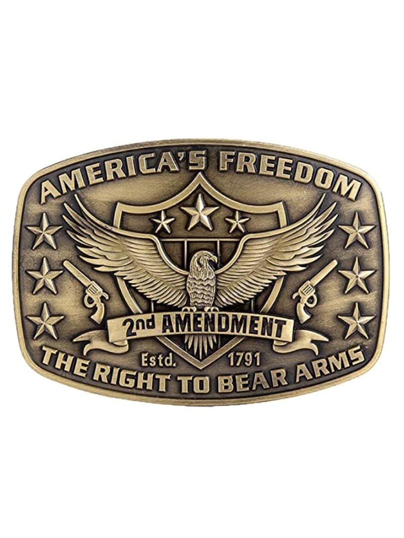 Dodaj swojej stylizacji wyrazisty i charakterystyczny akcent dzięki tej solidnej klamrze do paska w brązowym, postarzanym wykończeniu. Szczegółowy wzór przedstawia orła z rozpostartymi skrzydłami, otoczonego gwiazdami, co tworzy klasyczny i przyciągający wzrok wygląd. Ciepłe, brązowe wykończenie nadaje klamrze rustykalny i ponadczasowy charakter, odpowiedni zarówno na co dzień, jak i do bardziej dopracowanych stylizacji. Pasuje do pasków o szerokości do 4 cm, co ułatwia łączenie jej z większością pasków z wymiennymi klamrami.