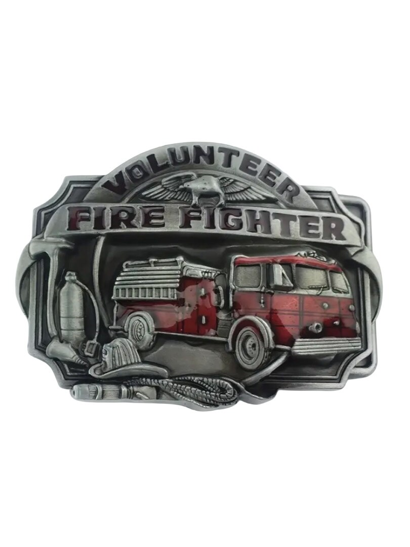 Szczegółowa klamra do paska z czerwonym wozem strażackim i napisem “Volunteer Fire Fighter”. Klamra pasuje do pasków o szerokości do 4 cm, co ułatwia dopasowanie do większości standardowych pasków z wymiennymi klamrami.