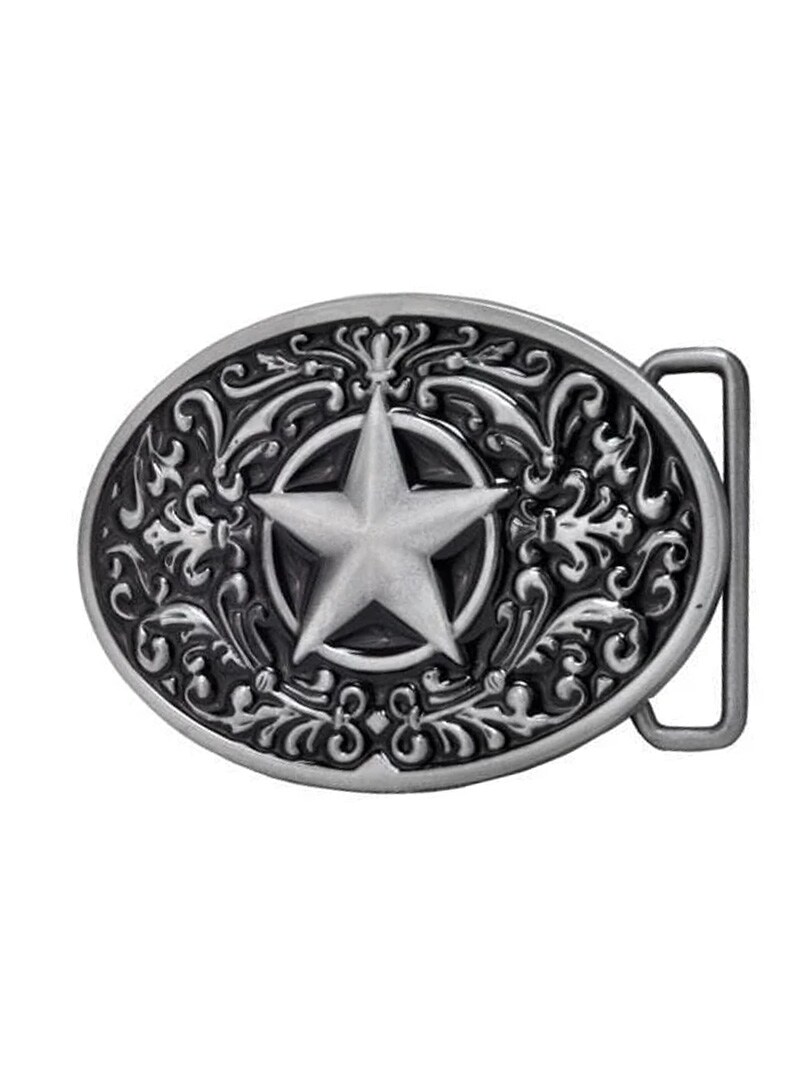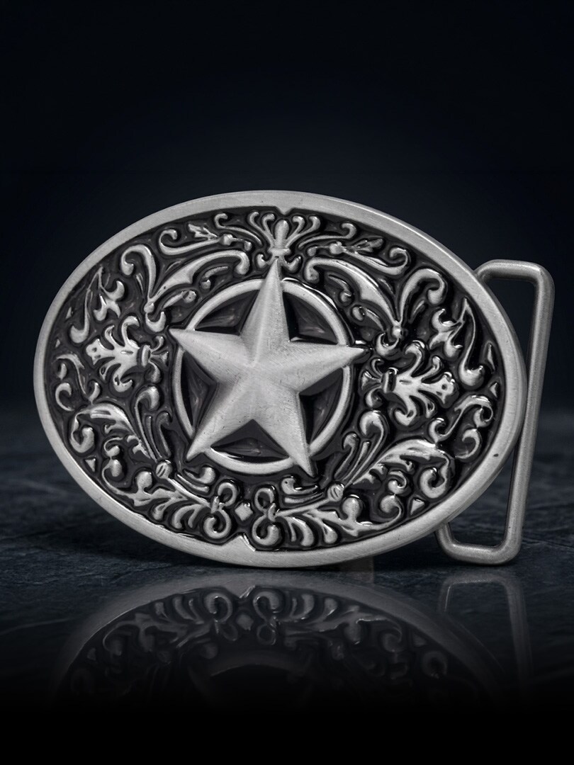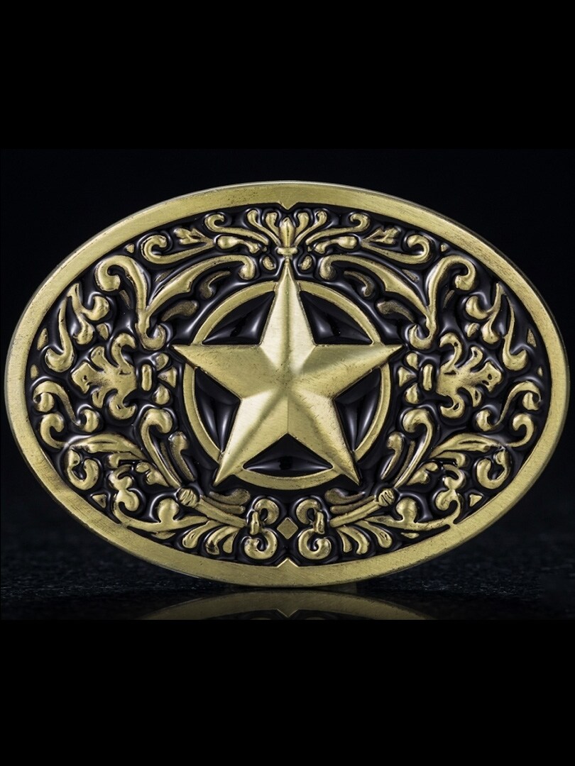 Owalna klamra do paska w klasycznym stylu western. Wzór inspirowany Teksasem i ozdobiony gwiazdami tworzy klasyczny i wyrazisty wygląd. Klamra pasuje do pasków o szerokości do 4 cm, co ułatwia dopasowanie do większości standardowych pasków z wymiennymi klamrami.