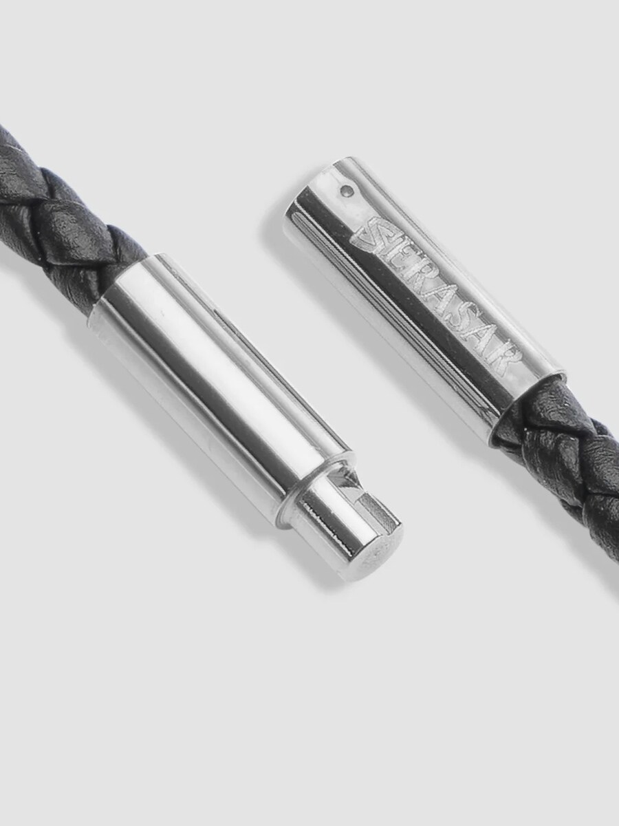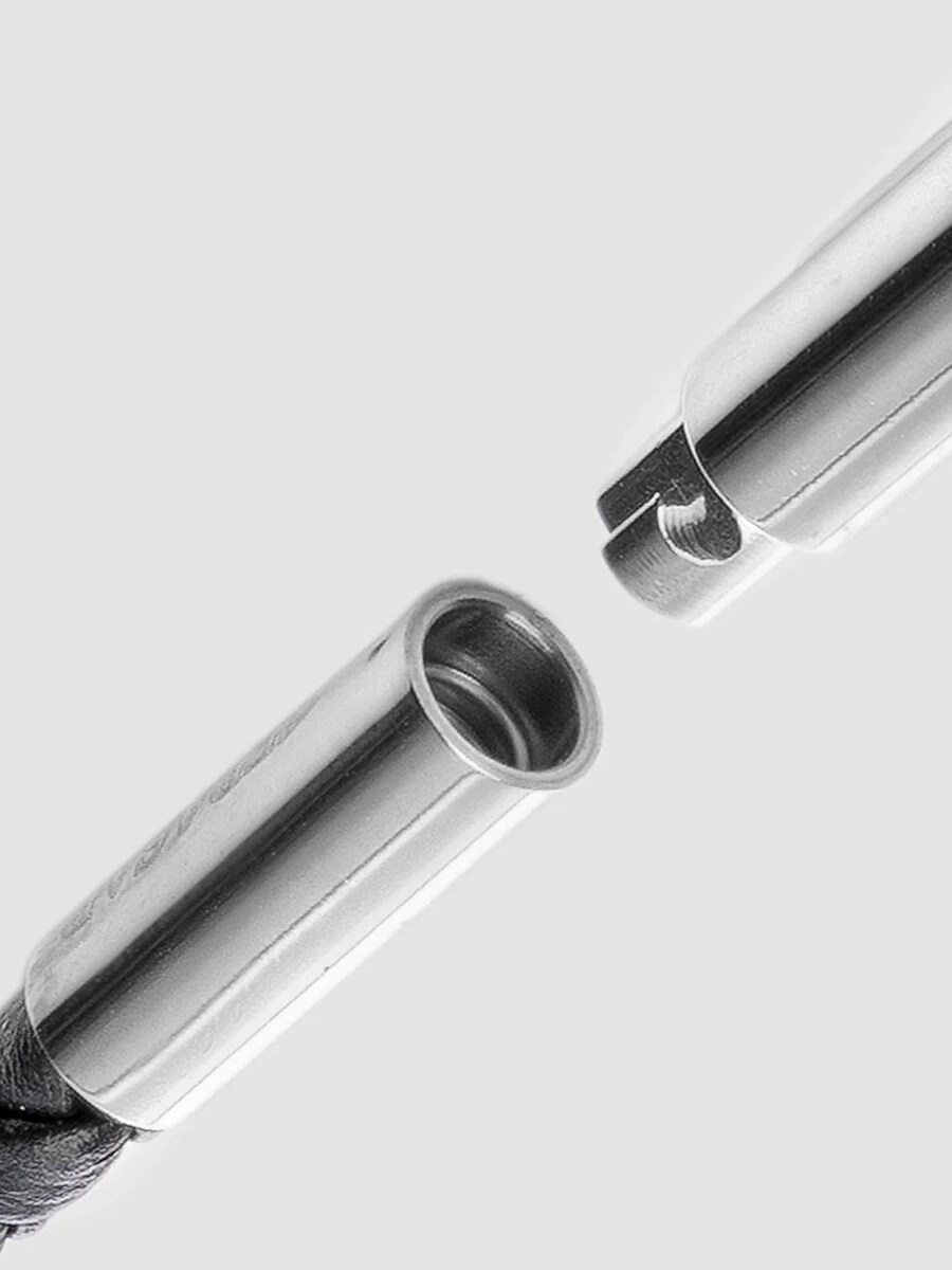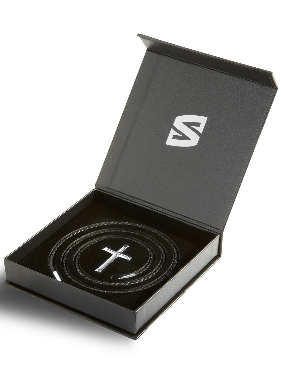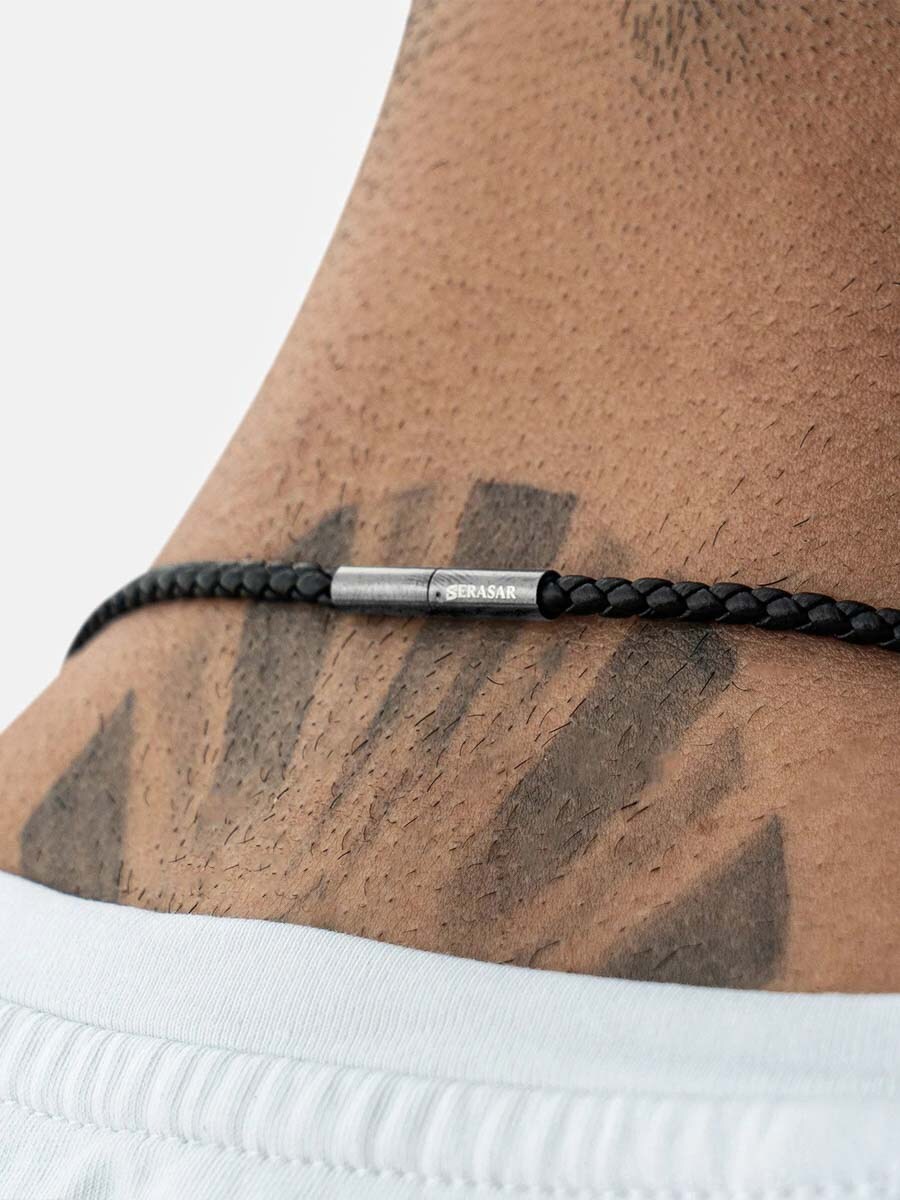 Stylowy naszyjnik z plecionym czarnym skórzanym paskiem i elegancką zawieszką w kształcie krzyża z polerowanej stali nierdzewnej. Zapinany na wygodny twist-lock, który trzyma pewnie, nie powodując ucisku. Skórzany pasek jest na tyle wąski, że możesz łatwo dodać inne zawieszki – idealne rozwiązanie, jeśli lubisz zmieniać styl. Komfortowy i ponadczasowy dodatek na każdą okazję.