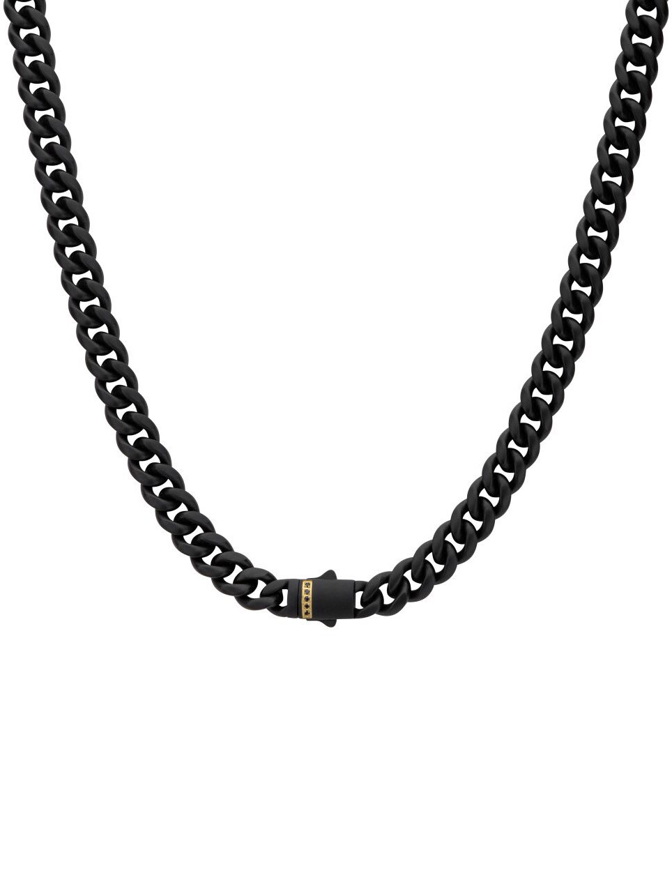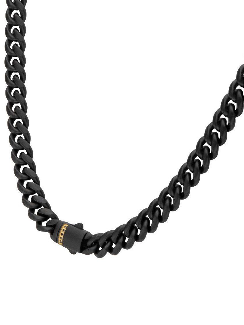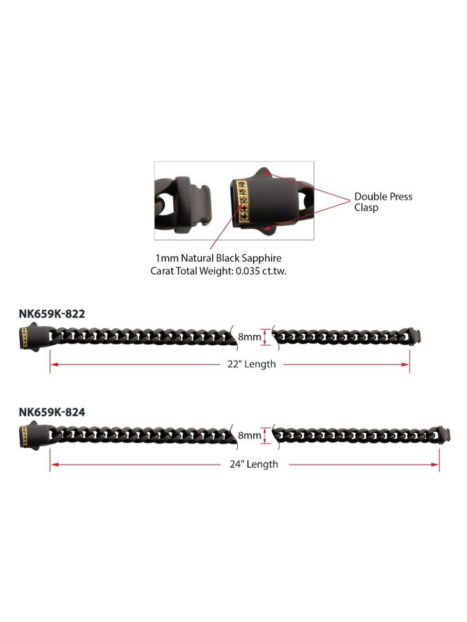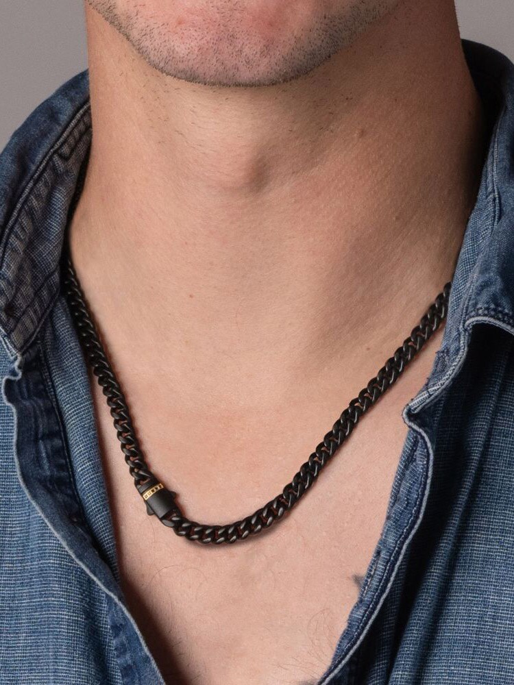 Kubański łańcuszek ze stali nierdzewnej z czarną powłoką IP i matowym wykończeniem. Zapięcie zdobią czarne szafiry osadzone w ekskluzywnym, podwójnym zapięciu składanym pokrytym 18-karatowym złotem, które zapewnia zarówno bezpieczeństwo, jak i luksusowy detal.