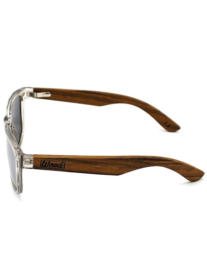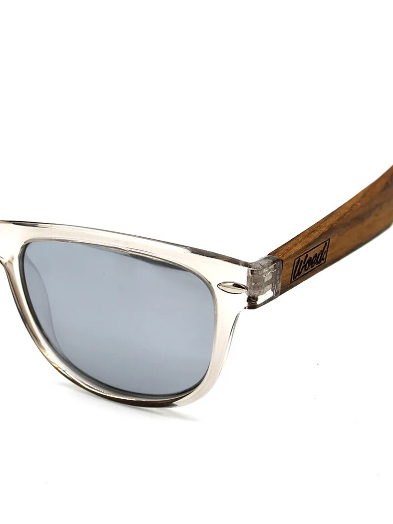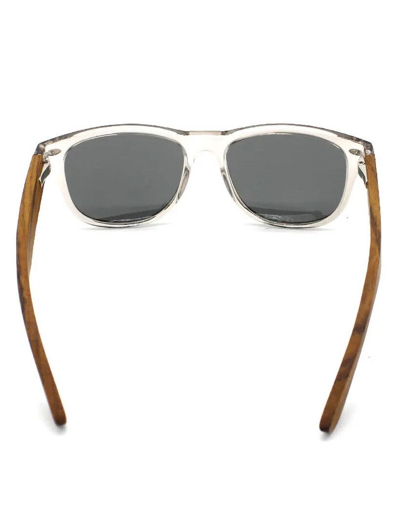 Okulary przeciwsłoneczne w fasonie wayfarer z transparentną oprawką i zausznikami z prawdziwego drewna. Model wyposażono w spolaryzowane soczewki UV400, które chronią przed słońcem i redukują uciążliwe refleksy. W zestawie ściereczka do czyszczenia i praktyczny woreczek do przechowywania.