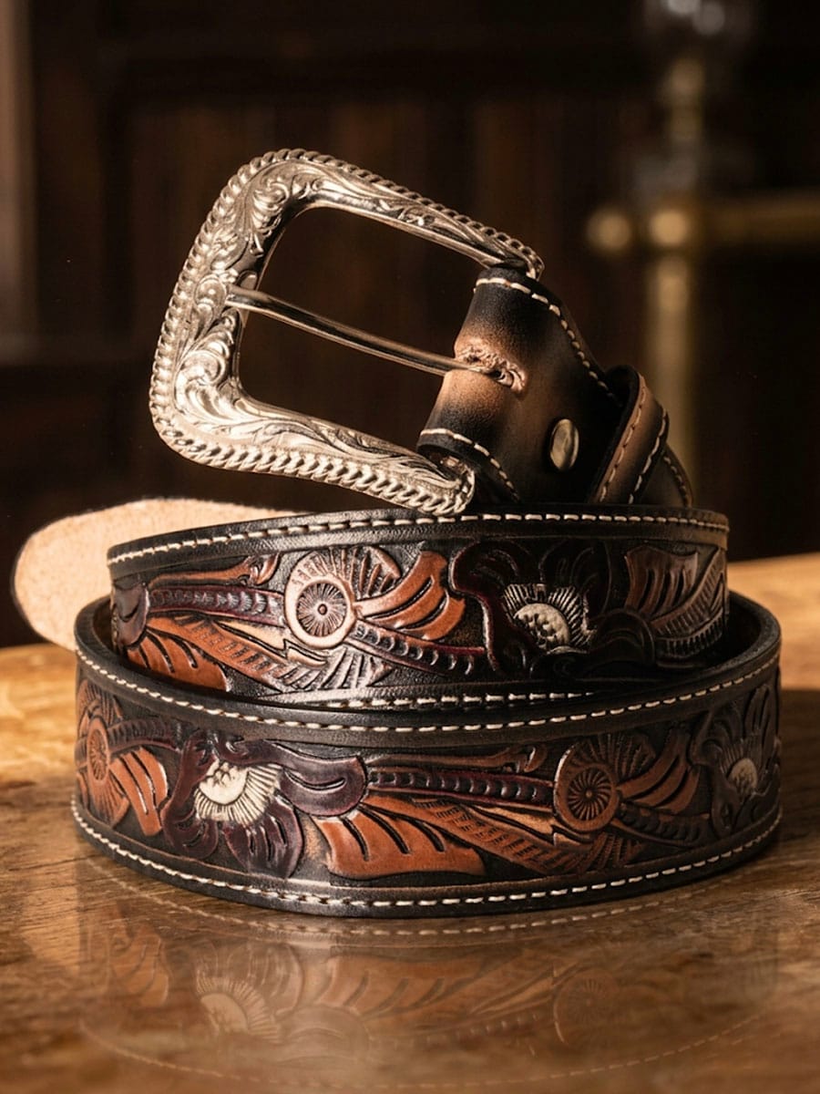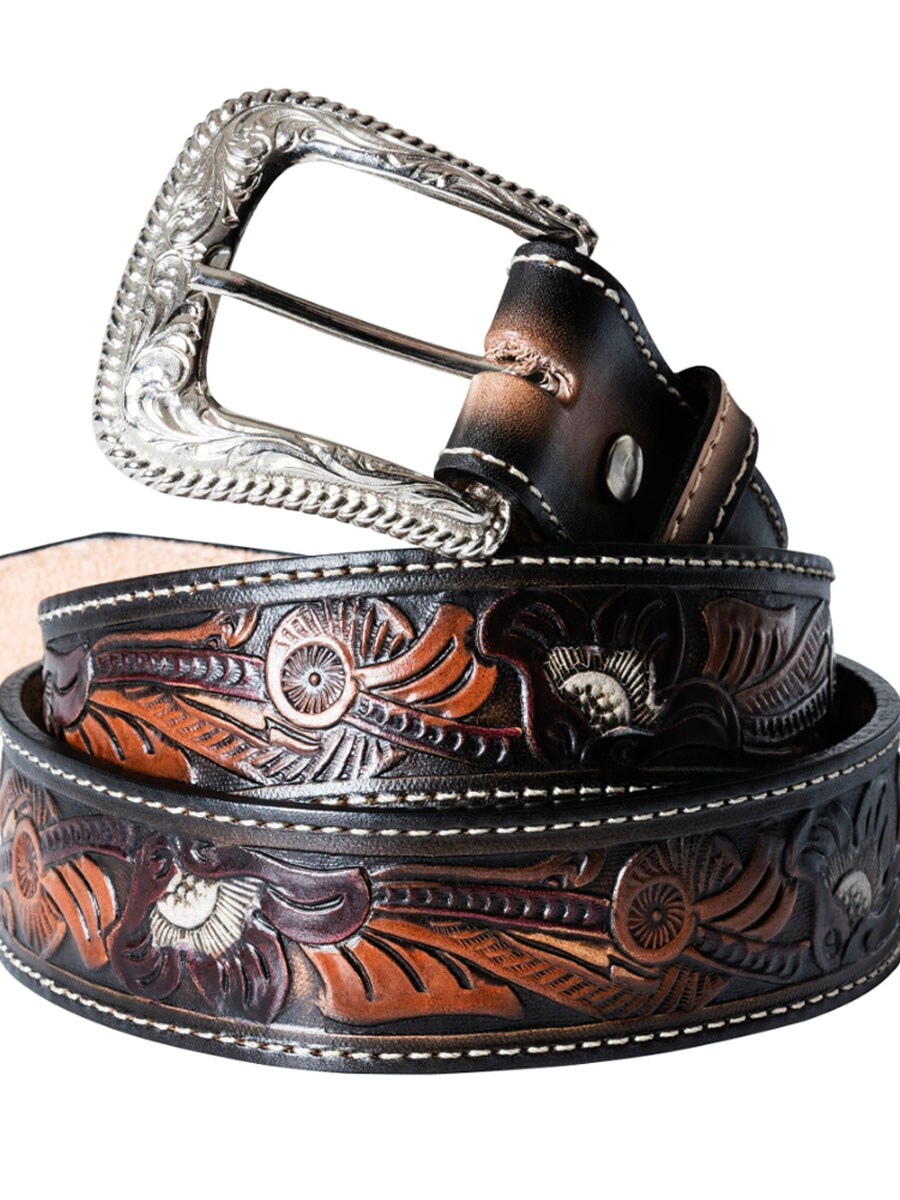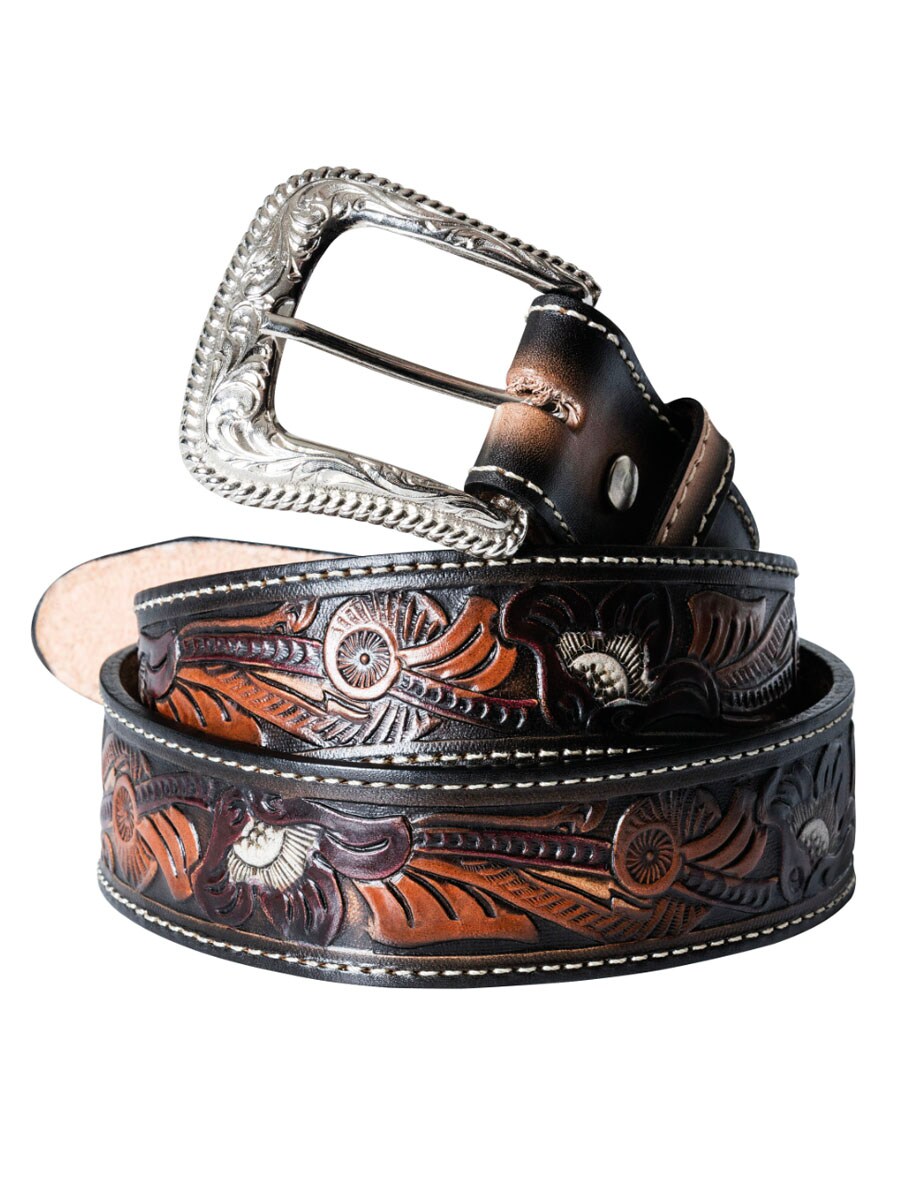 Stylowy pasek westernowy wykonany z grubej skóry krowiej, z dekoracyjnym tłoczonym wzorem i kontrastowymi przeszyciami, które nadają mu klasyczny i dopracowany wygląd. Stylowa klamra jest wymienna, co ułatwia dopasowanie paska do niemal każdej klamry.