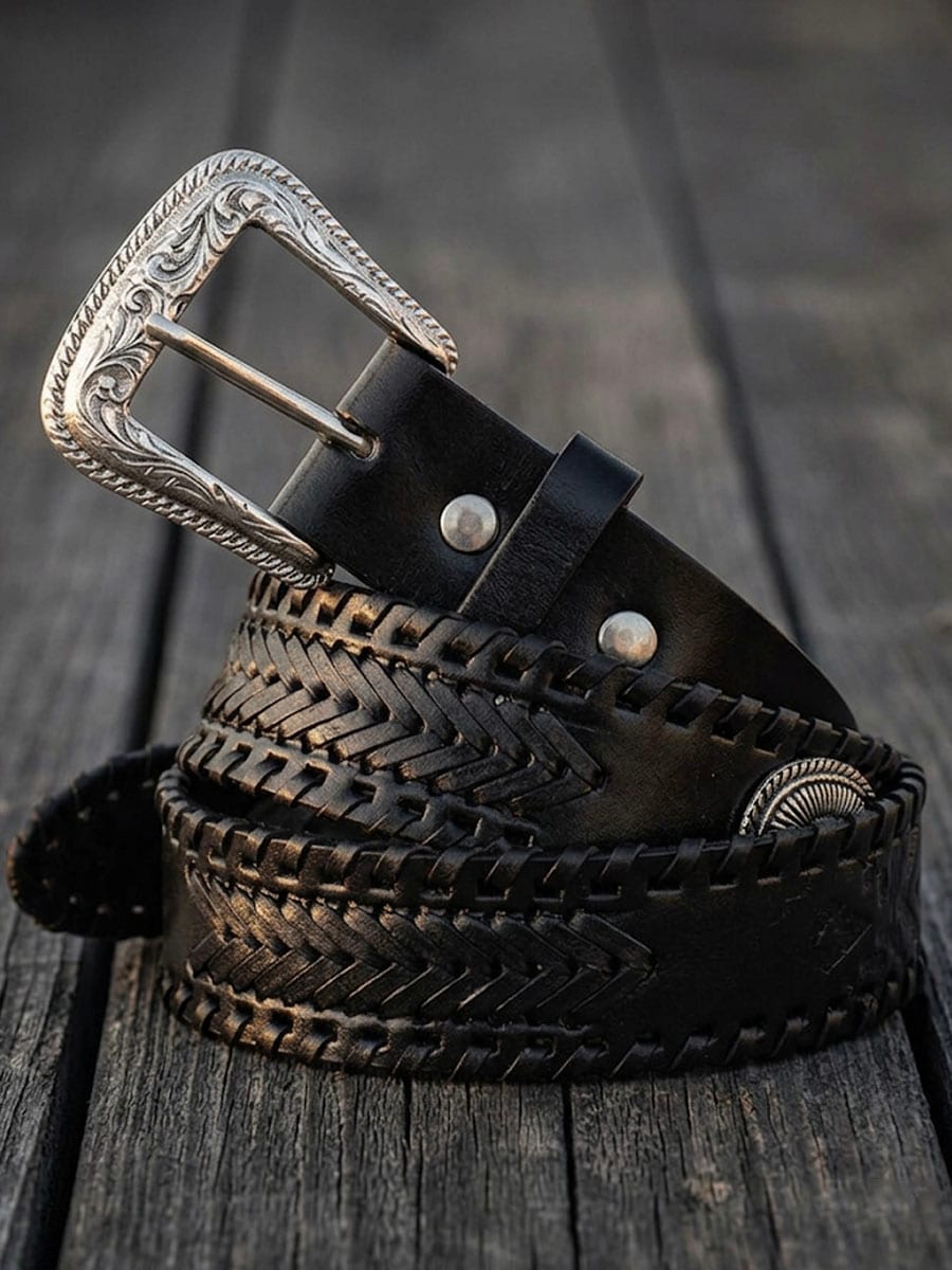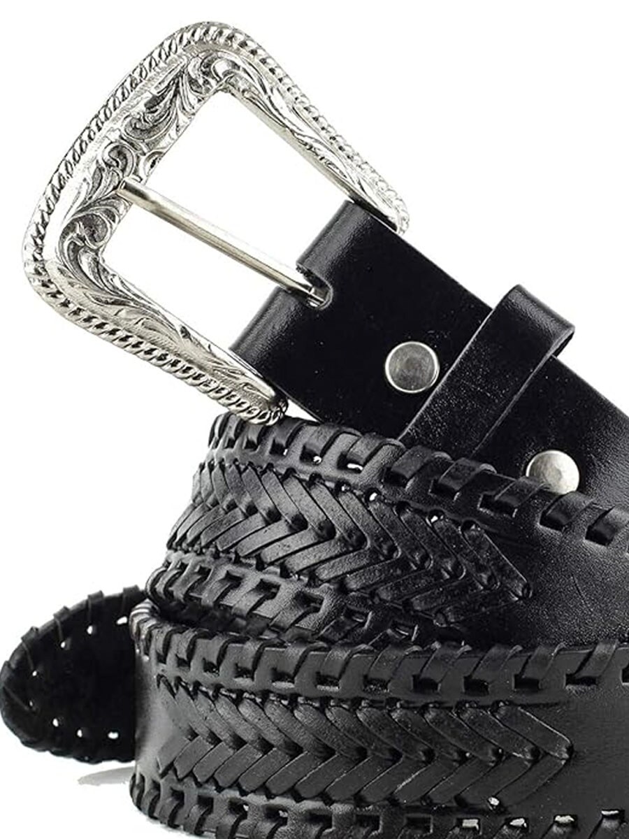 Wysokiej jakości pasek westernowy wykonany z grubej skóry krowiej, z plecionymi detalami i dekoracyjnymi elementami, które nadają mu klasyczny, kowbojski charakter. Stylowa klamra jest wymienna, co ułatwia dopasowanie paska do niemal każdej klamry.