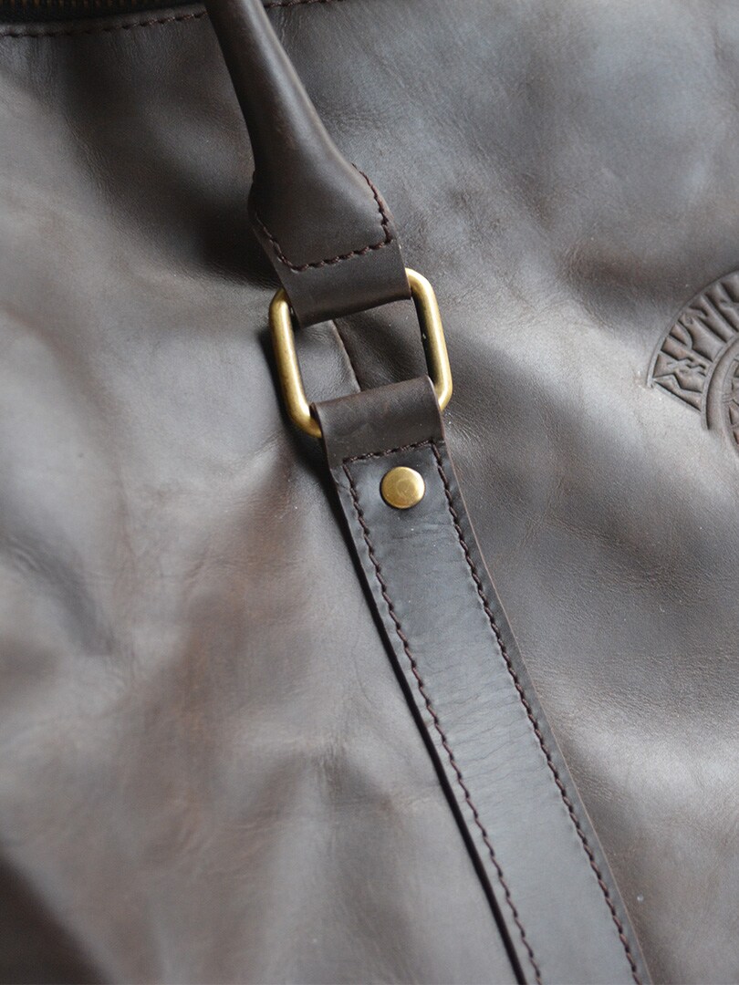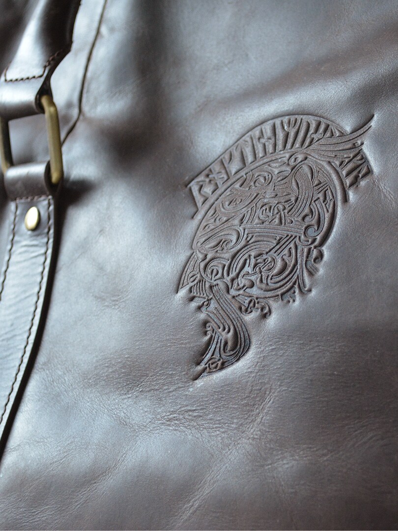 Pojemna i elegancka torba podróżna wykonana z wysokiej jakości skóry. Łączy praktyczną funkcjonalność z tłoczonym motywem inspirowanym wikingami, który nadaje jej wyjątkowy charakter. Idealna na podróże, trening lub wszędzie tam, gdzie potrzebna jest stylowa torba z dużą ilością miejsca. Można ją wygodnie nosić za uchwyty lub regulowany pasek na ramię.