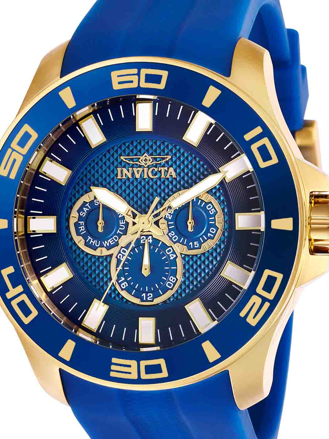 Sportowy zegarek z detalami w kolorze złotym i silikonowym paskiem zapewniającym optymalny komfort. Posiada dodatkowe szkło odporne na zarysowania i jest zasilany precyzyjnym mechanizmem kwarcowym. Trzy dodatkowe tarcze pokazujące dzień tygodnia, datę i 24-godzinny wyświetlacz. Wodoszczelny do 100 metrów.