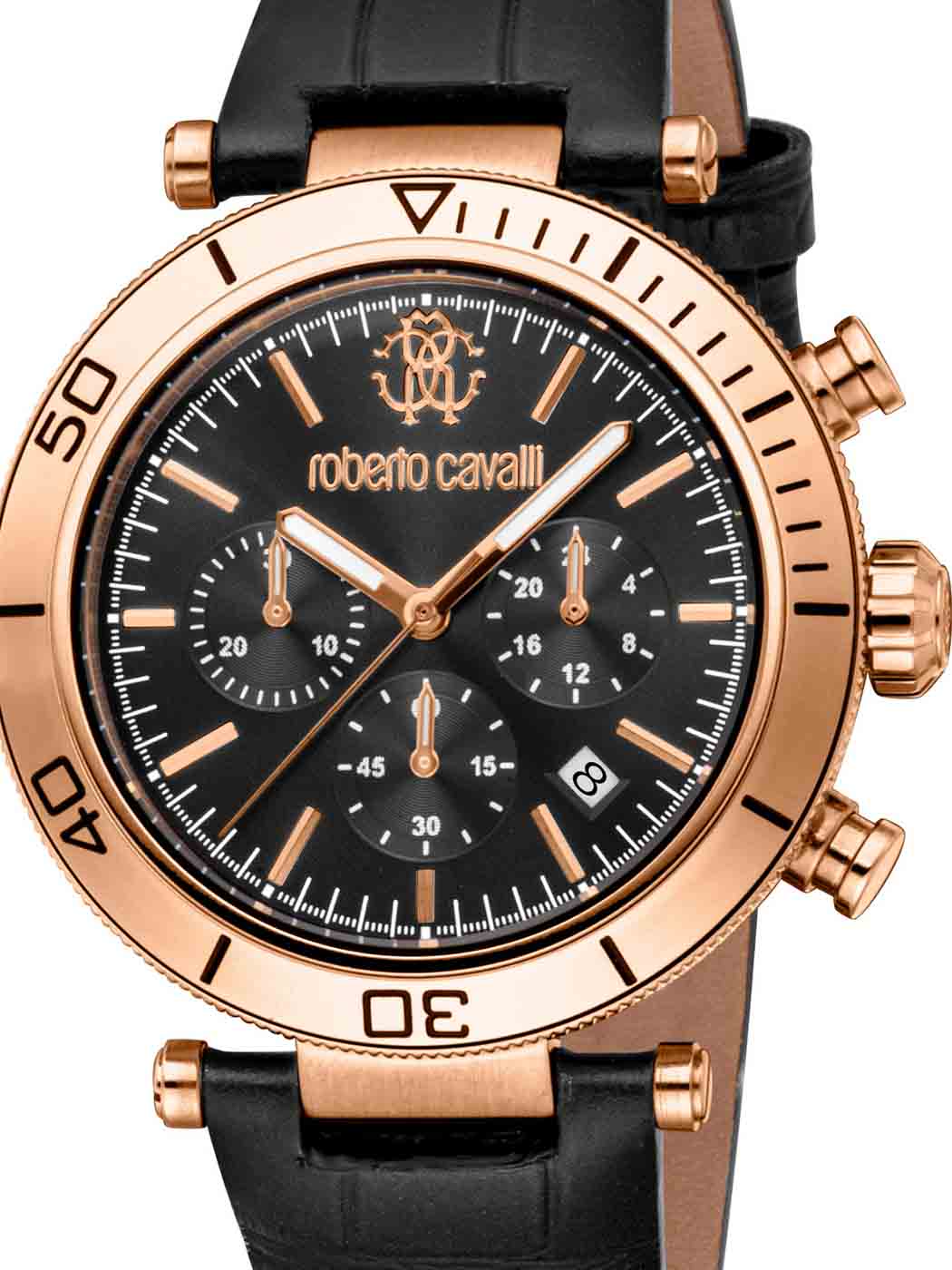 Czarny zegarek ze stalową kopertą w kolorze różowego złota. Funkcja chronografu, datownik i trzy dodatkowe tarcze zapewniają techniczną precyzję. Czarny skórzany pasek z wytłoczonym wzorem skóry gada podkreśla klasę i elegancję. Wodoszczelność do 100 metrów.