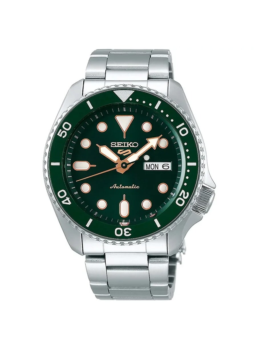 Seiko 5 Sports SRPD63K1 to ekskluzywny męski zegarek, który wyróżnia się głęboko zieloną tarczą i eleganckimi wskazówkami w kolorze różowego złota. Zegarek napędzany jest automatycznym mechanizmem, który ładuje się od Twoich ruchów, co oznacza, że nie ma potrzeby wymiany baterii. Solidna koperta i bransoleta ze stali nierdzewnej uzupełnione są wytrzymałym szkłem Hardlex oraz wyraźnym wyświetlaczem dnia i daty. Dzięki wodoodporności do 100 metrów, ten model został zaprojektowany, aby sprostać zarówno codziennym wyzwaniom, jak i aktywnościom sportowym. Idealne połączenie sportowej funkcjonalności i wyrafinowanego stylu dla nowoczesnego mężczyzny.