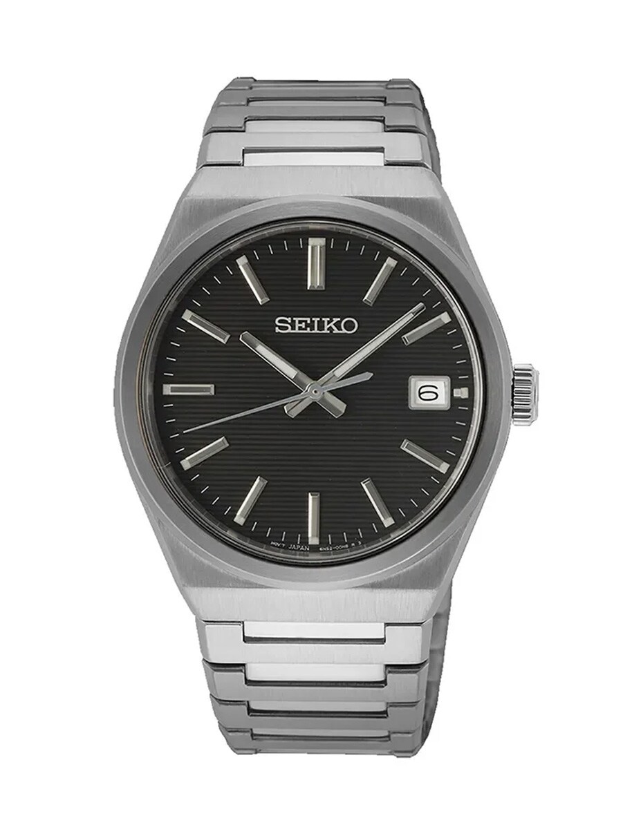 Seiko SUR557P1 to wyrafinowany zegarek męski, który oferuje klasyczny design z nowoczesnym akcentem ze stali nierdzewnej. Czarna tarcza ma elegancką poziomą strukturę i wyraźne srebrne indeksy oraz datownik na godzinie trzeciej. Zegar chroniony jest przez odporne na zarysowania szkło szafirowe, które zapewnia trwałość i przejrzystość w czasie. Dzięki niezawodnemu mechanizmowi kwarcowemu i wodoszczelności do 100 metrów, jest to wszechstronny dodatek zarówno na co dzień, jak i na specjalne okazje. Zintegrowana bransoleta zapewnia wygodne dopasowanie i dopełnia stylowy wygląd.