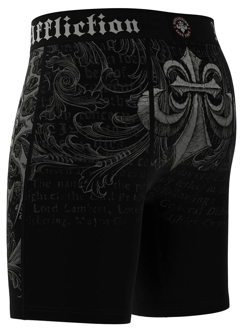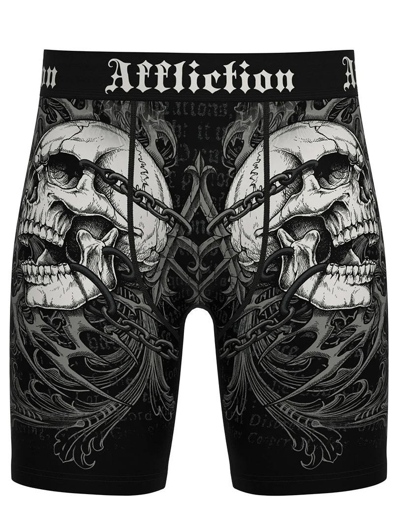 Bokserki z motywem czaszki w klasycznym stylu Affliction. Wykonane z miękkiego i elastycznego materiału, zapewniają doskonały komfort przez cały dzień. Szeroka guma z logo Affliction utrzymuje je na miejscu i dopełnia wygląd. Idealne dla osób, które chcą bielizny wyróżniającej się równie mocno jak reszta stylizacji.