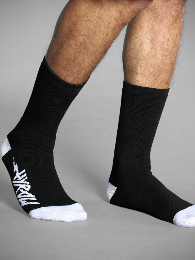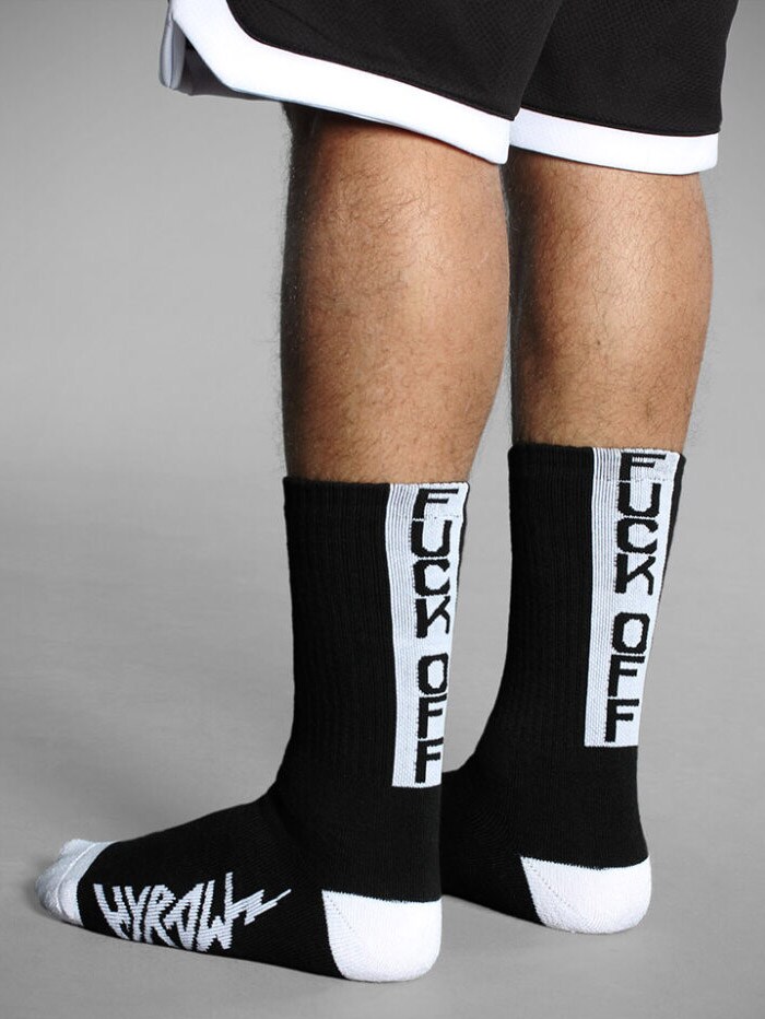 Ten zestaw zawiera dwie pary czarnych skarpet z pogrubionym napisem "FUCK OFF" na górze i logo HYRAW w kolorze czerwonym i białym na dole. Idealne dla tych, którzy chcą postawić na swoim - dosłownie.