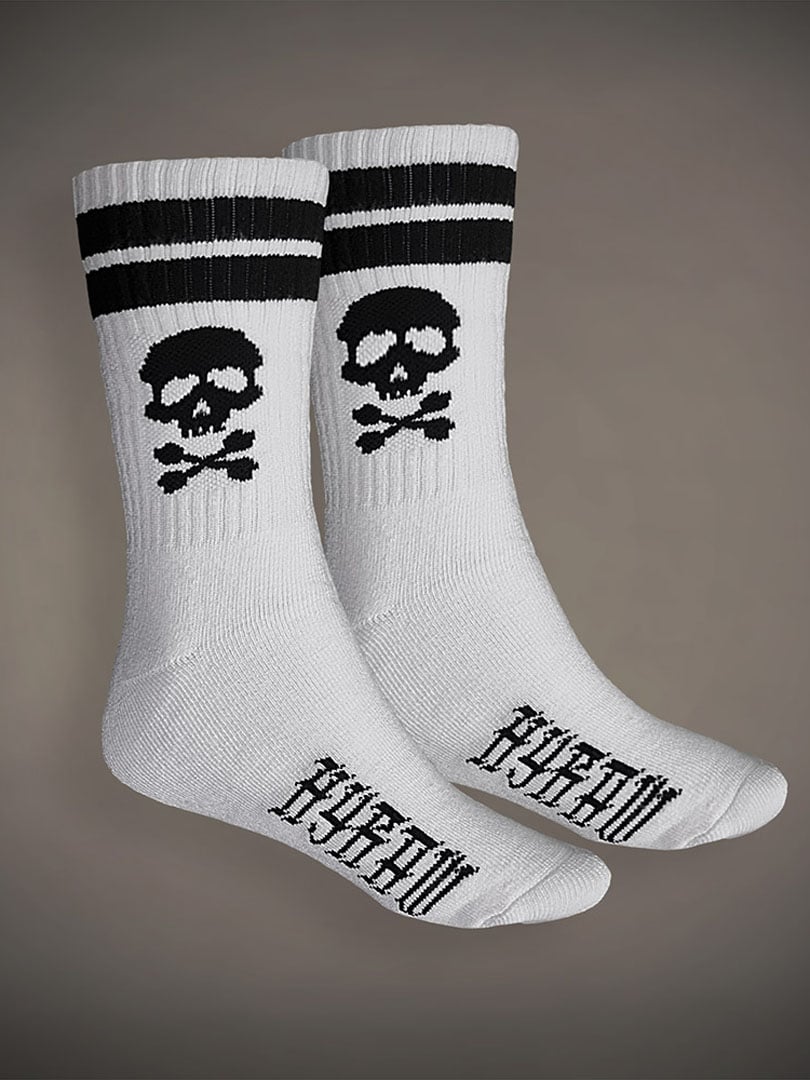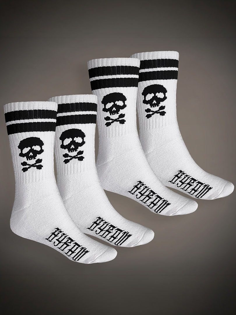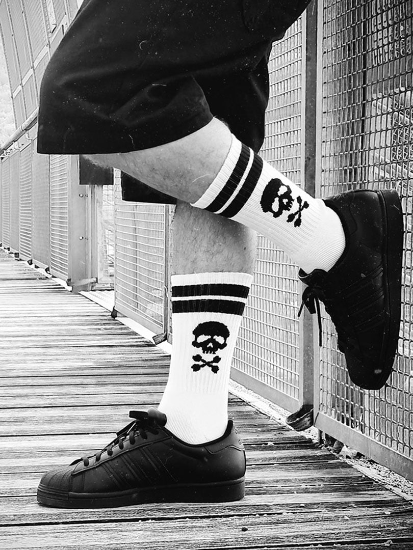 Wygodne skarpety z czarnym motywem czaszki, logo oraz paskami. Ściągacz u góry.
