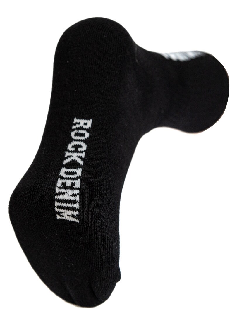 Wysokie skarpety do codziennego użytku lub na trening. Prążkowany ściągacz zapewnia dobre dopasowanie i sportowy wygląd. Napis „Rockdenim” małymi białymi literami pod stopą.