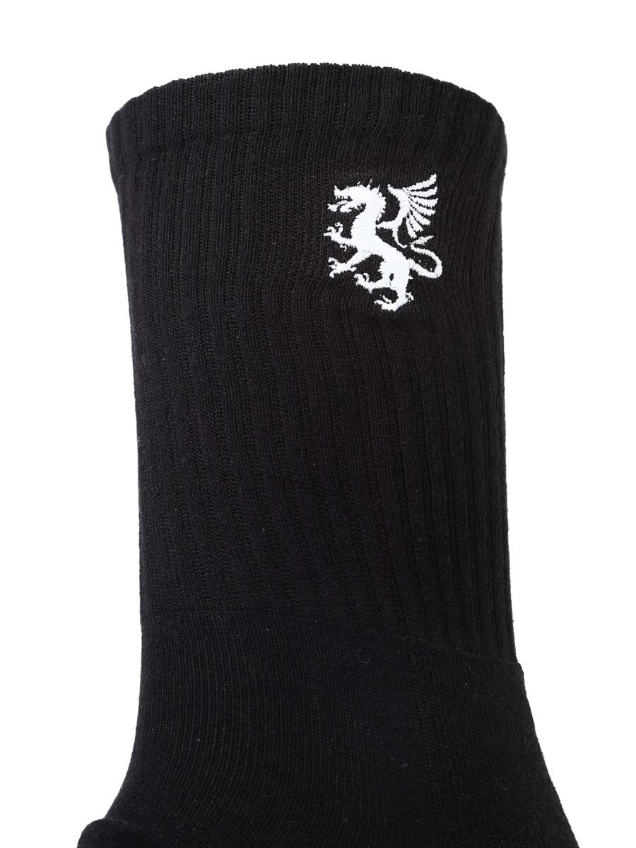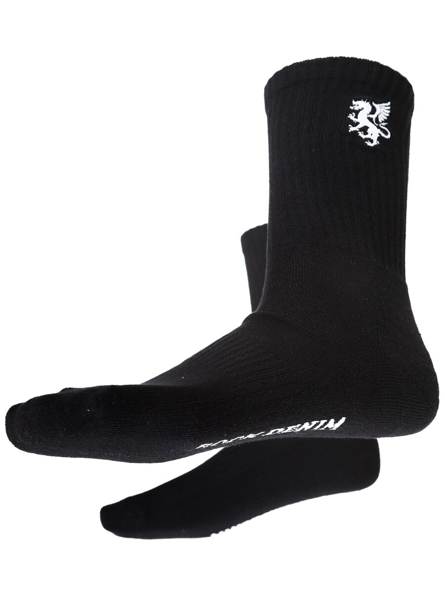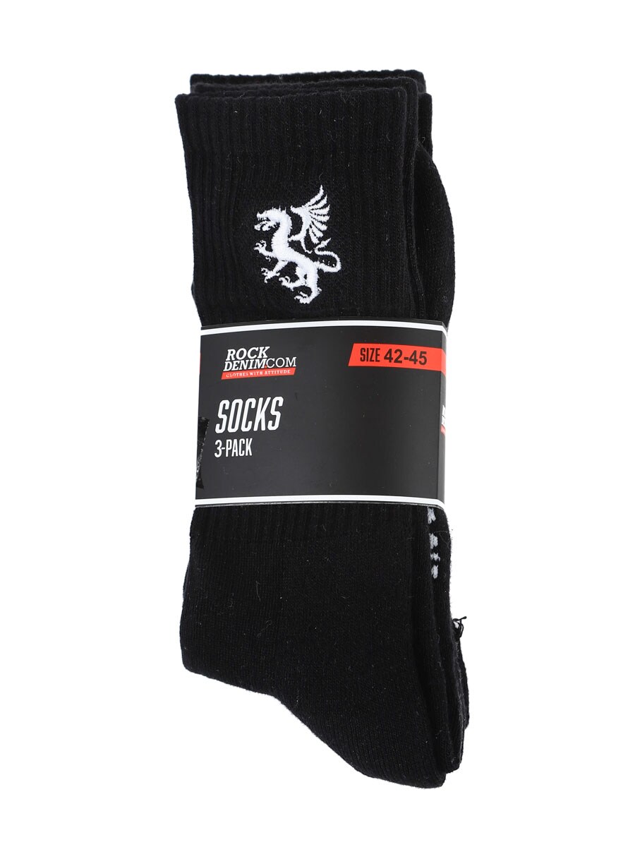 Czarne skarpety z dopasowanym nadrukiem w kolorze białym. Idealne do codziennego użytku lub na trening. Prążkowany ściągacz zapewnia dobre dopasowanie i sportowy wygląd. Napis „Rockdenim” małymi białymi literami pod stopą.