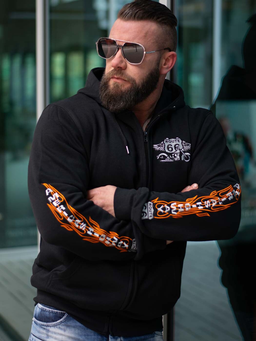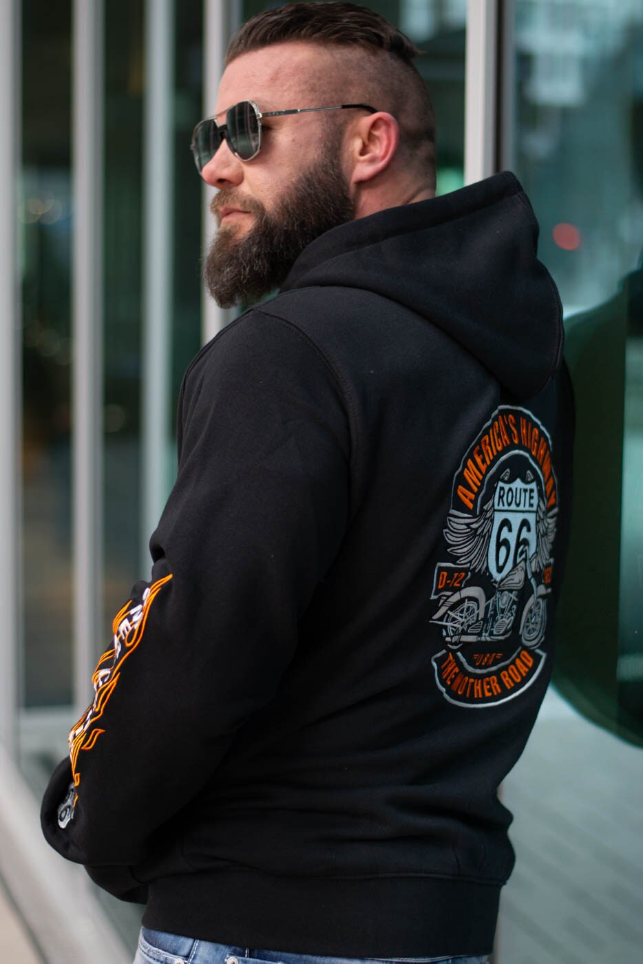 Bluza zapinana na zamek, z kieszeniami na brzuchu. Przestronny i wygodny model, zdobiony grafiką inspirowaną motocyklami. Szerokie ściągacze u dołu i przy rękawach.