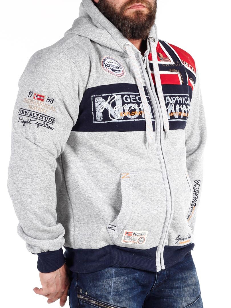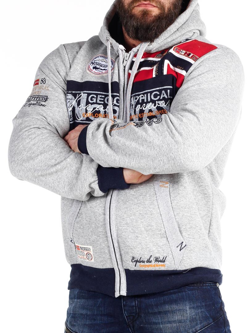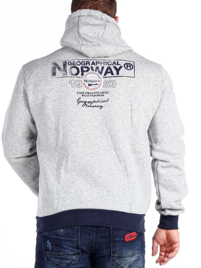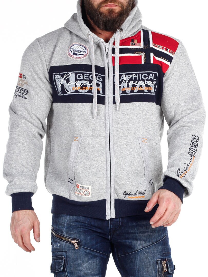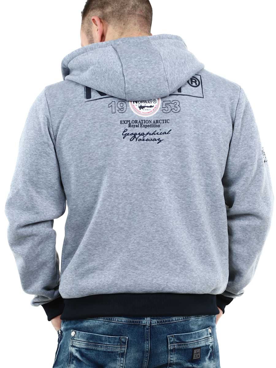 Bluza z obszernym kapturem, zapinana na suwak, z dużymi kieszeniami na brzuchu. Logo i wzór marki są widoczne zarówno z przodu, jak i z tyłu. Przy rękawach znajdują się granatowe ściągacze.