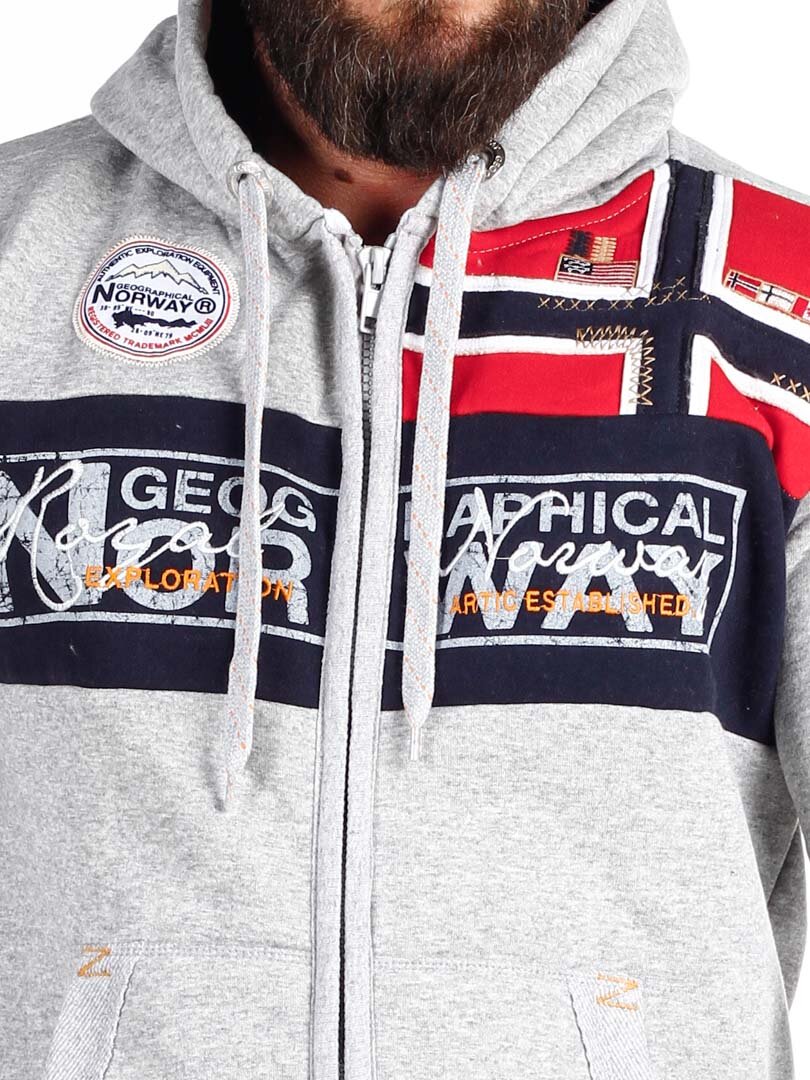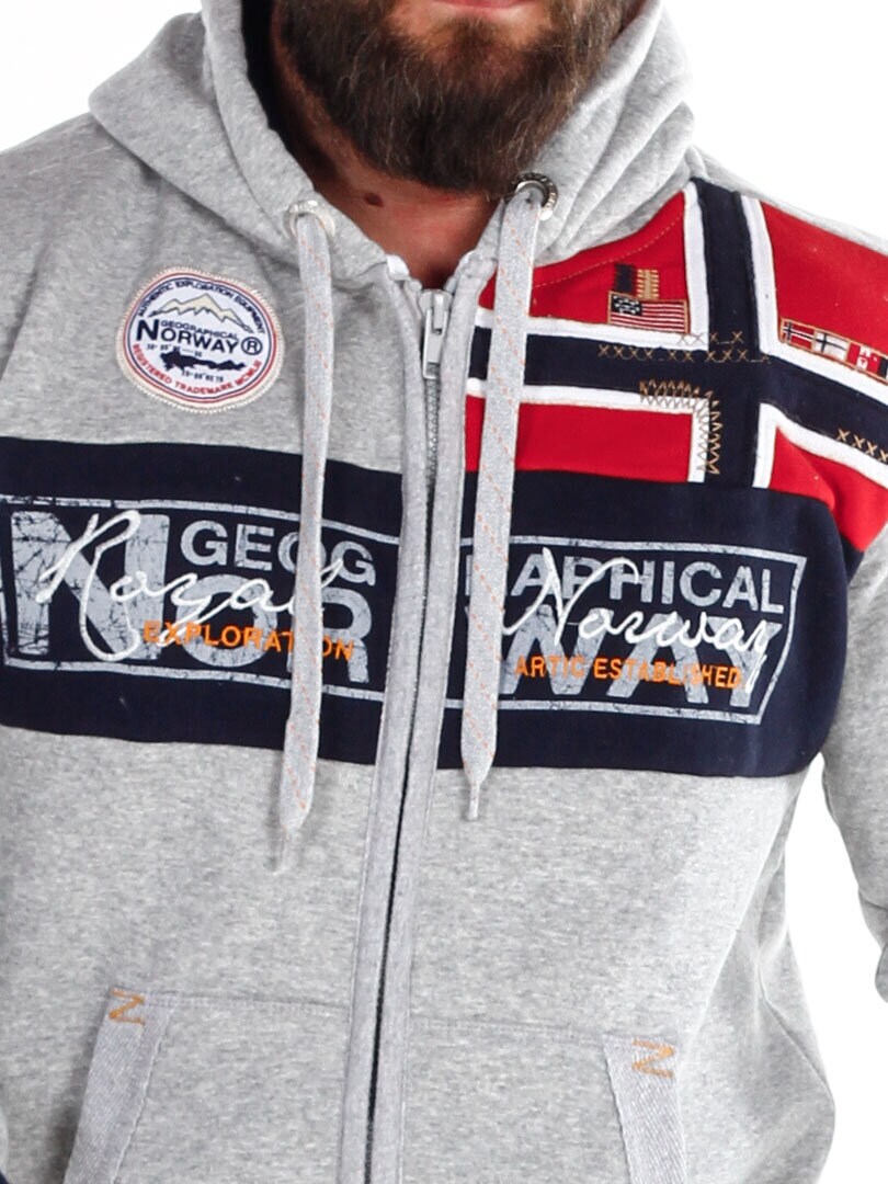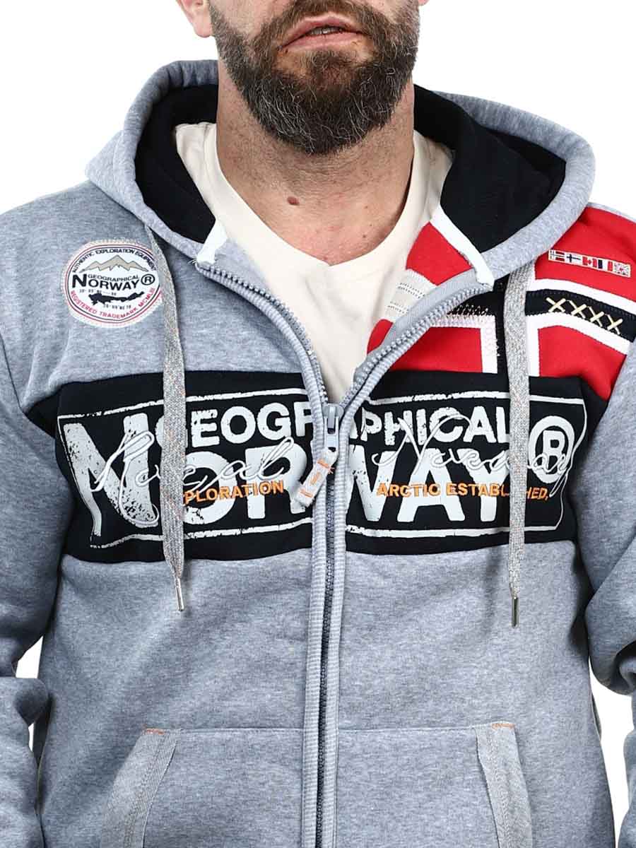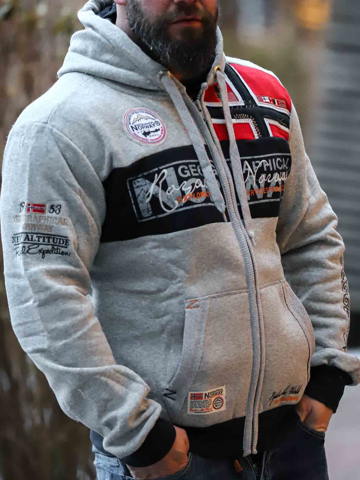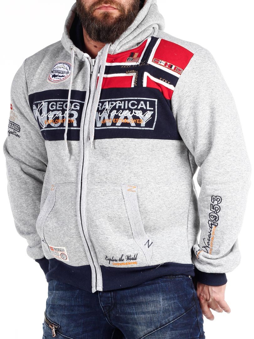 Bluza z obszernym kapturem, zapinana na suwak, z dużymi kieszeniami na brzuchu. Logo i wzór marki są widoczne zarówno z przodu, jak i z tyłu. Przy rękawach znajdują się granatowe ściągacze.