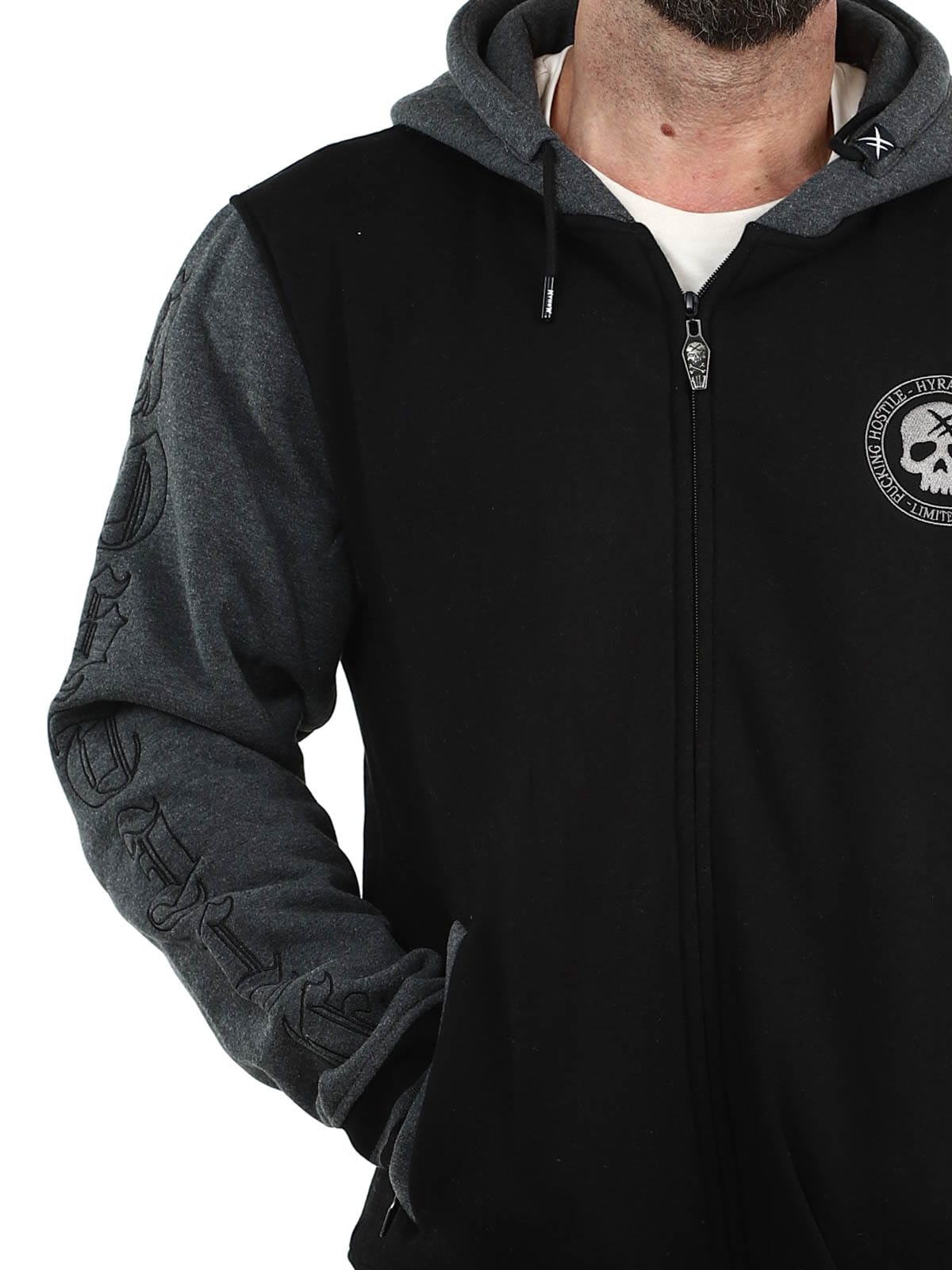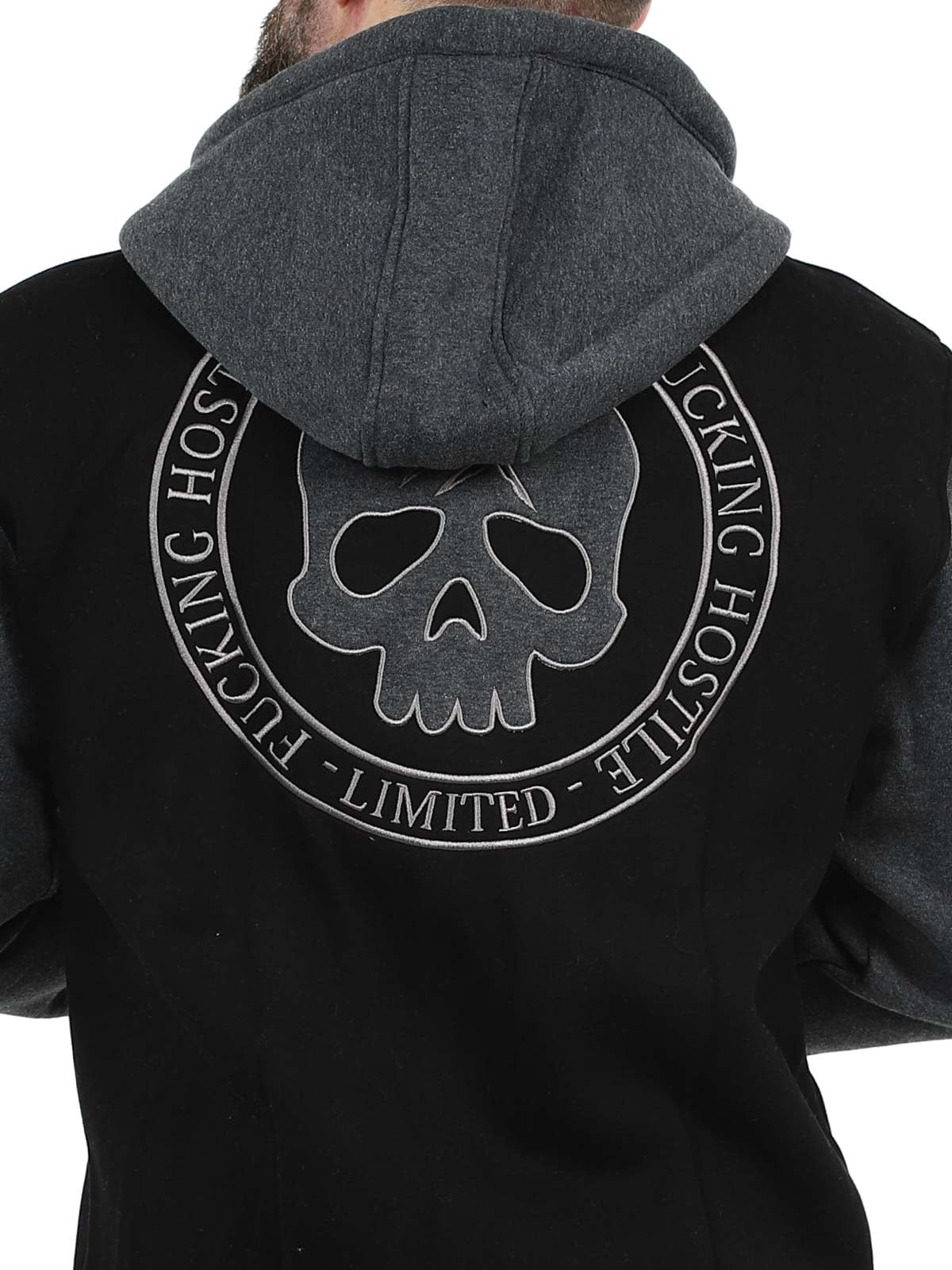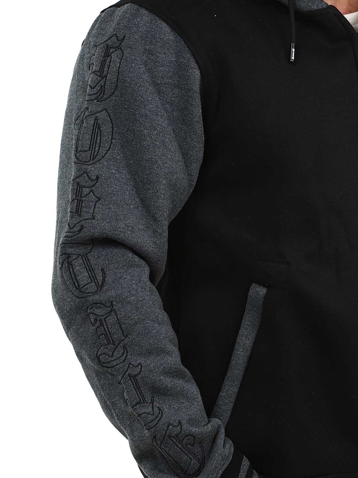 Czarna bluza z ciemnoszarym kapturem i rękawami. Zaprojektowana z haftowanymi nadrukami na piersi, plecach i rękawach. Bluza posiada szczotkowane wnętrze, dwie kieszenie zapinane na zamek oraz ściągacze przy mankietach i na dole.
