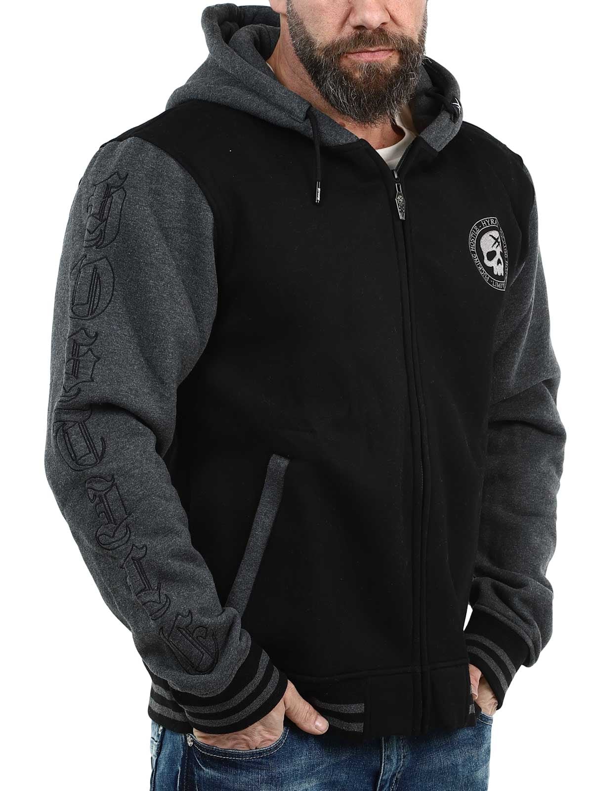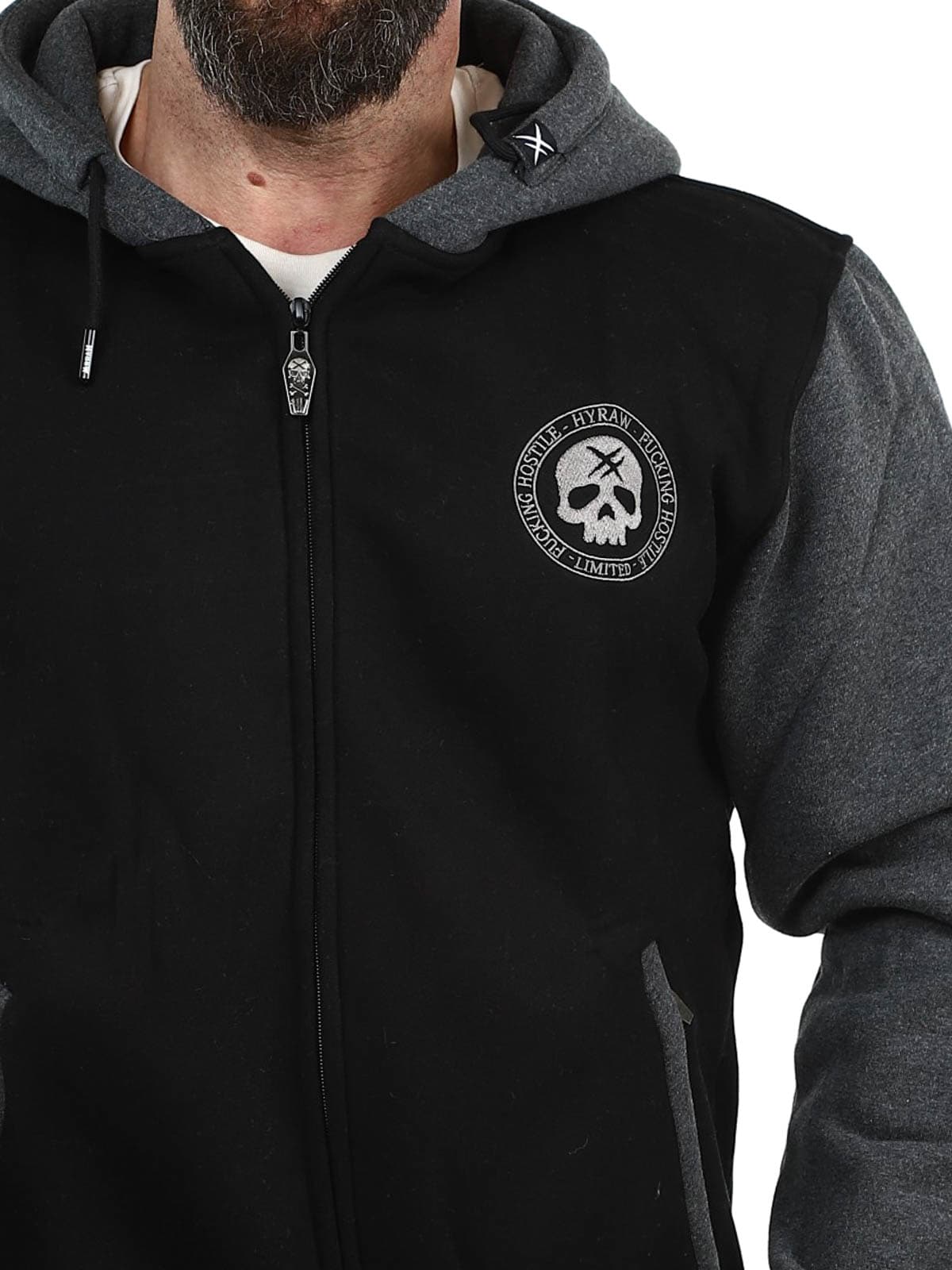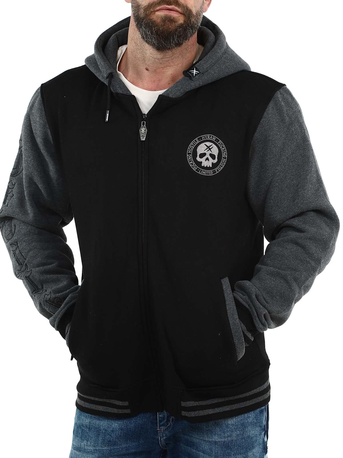 Czarna bluza z ciemnoszarym kapturem i rękawami. Zaprojektowana z haftowanymi nadrukami na piersi, plecach i rękawach. Bluza posiada szczotkowane wnętrze, dwie kieszenie zapinane na zamek oraz ściągacze przy mankietach i na dole.