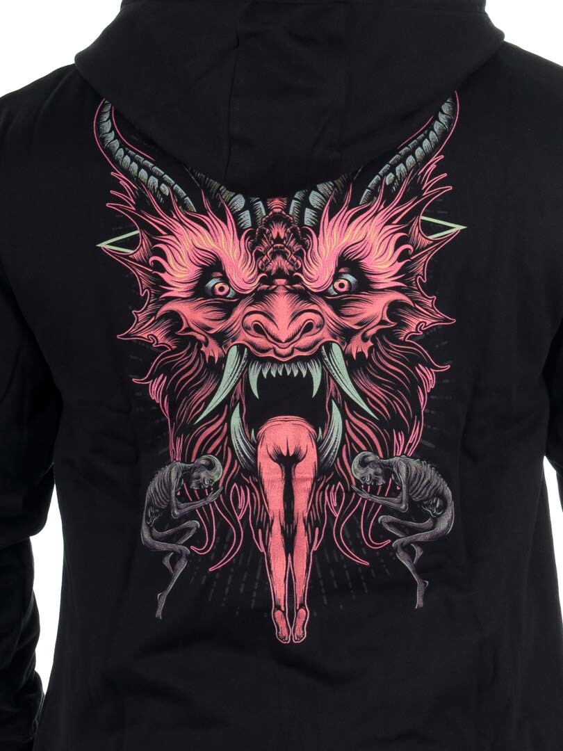 Solidna bluza zaprojektowana z dużym nadrukiem na plecach, mniejszym logo na piersi oraz dopasowanymi motywami wzdłuż rękawów. Posiada kaptur ze sznurkiem oraz dwie otwarte kieszenie z przodu. Idealna dla osób, które chcą wyróżniać się bez rezygnacji z wygody.