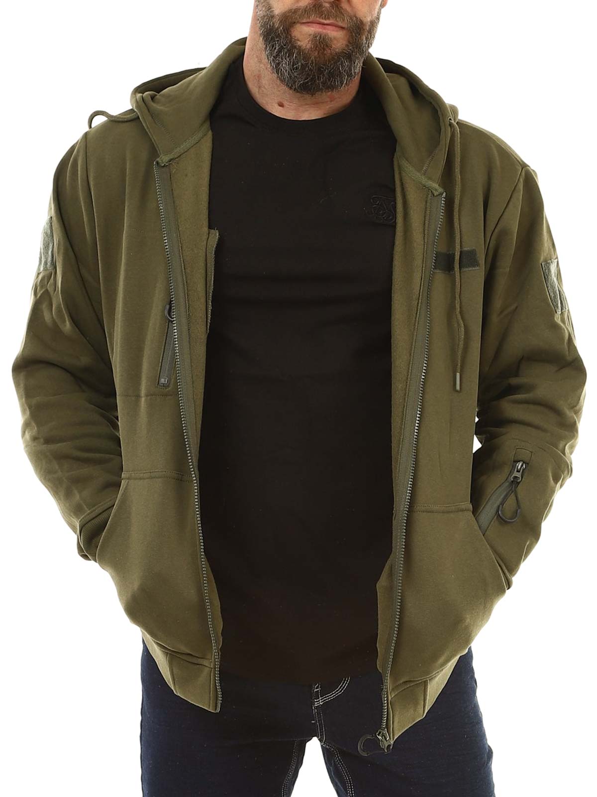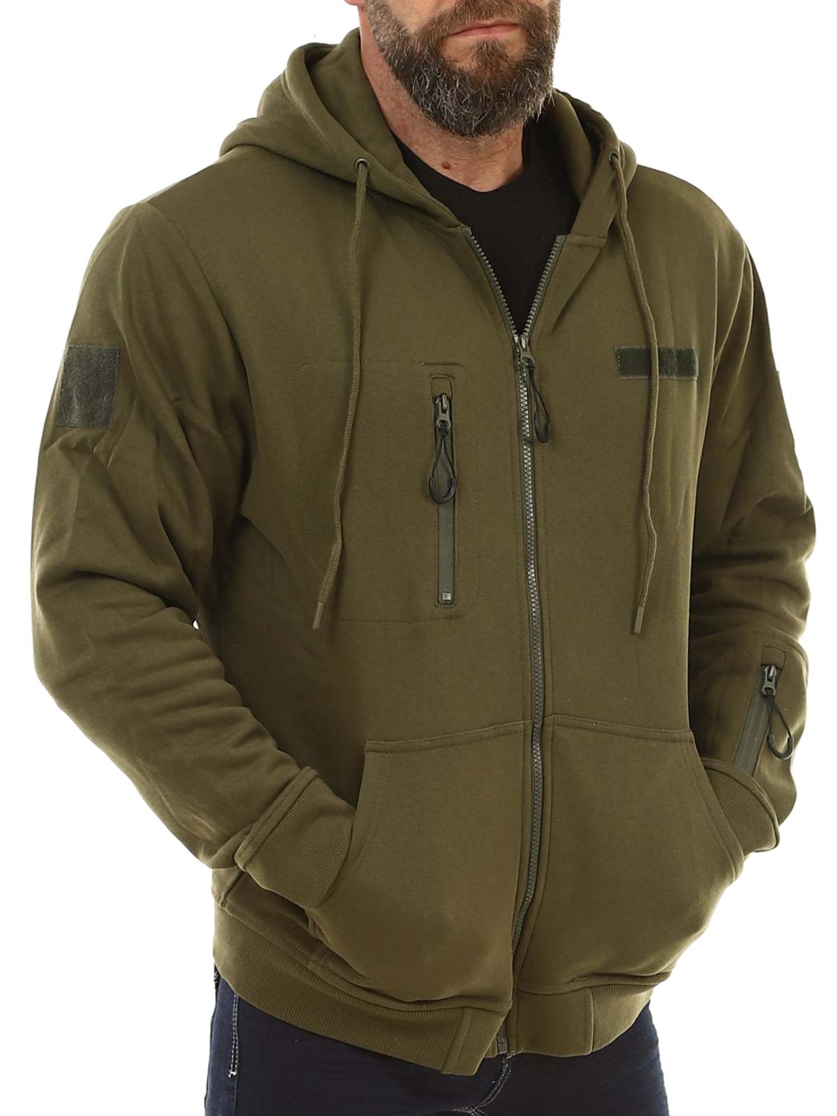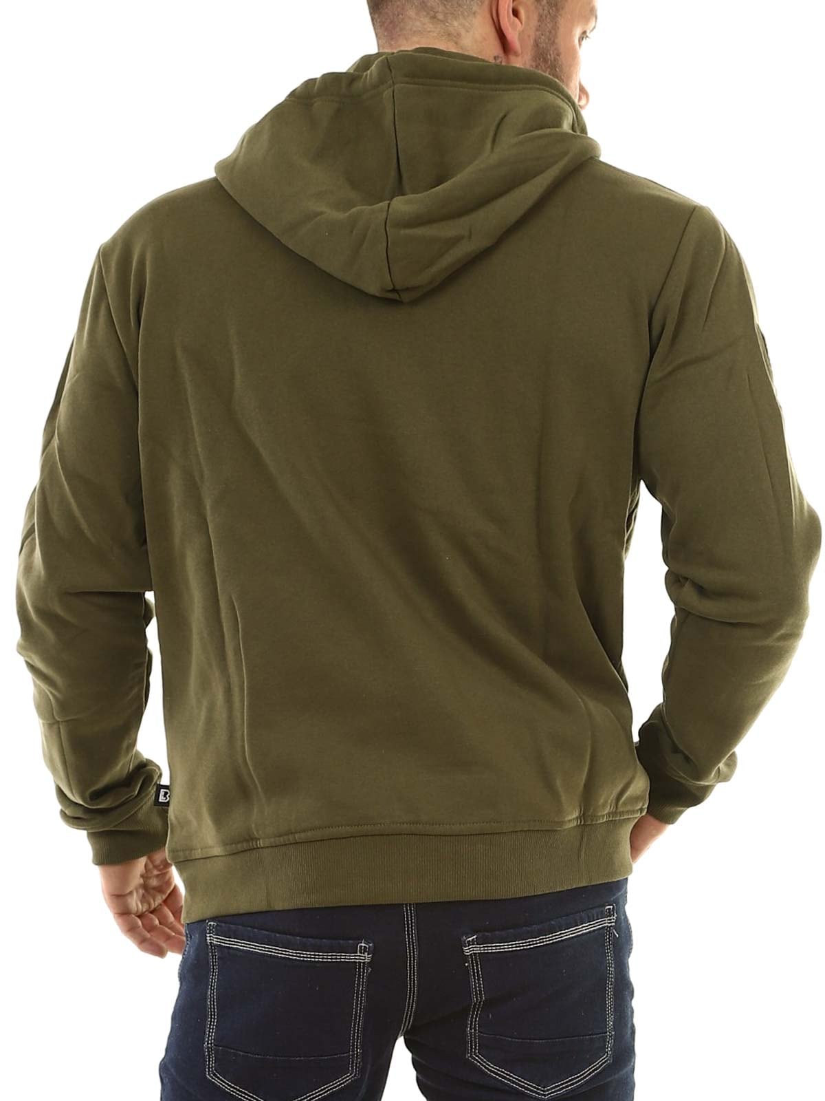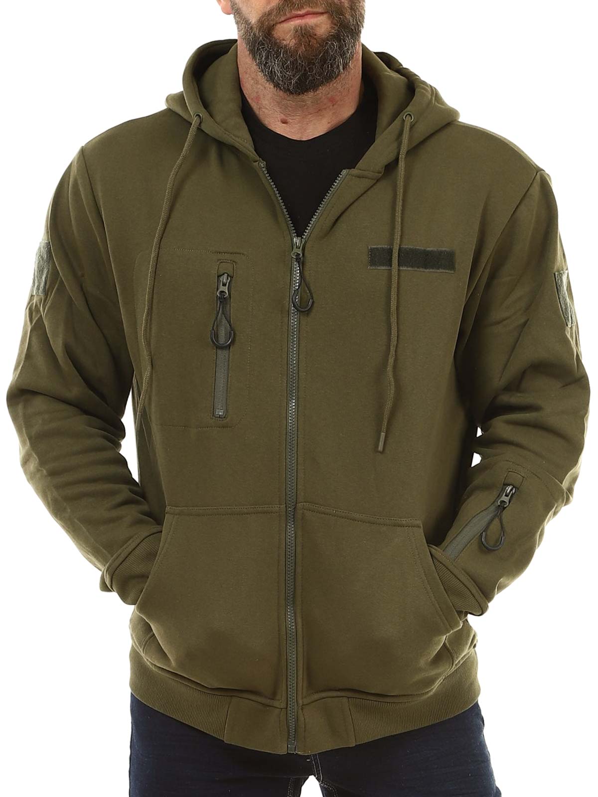 Praktyczna bluza z kapturem w ciemniejszym zielonym kolorze. Bluza posiada zamek błyskawiczny z przodu oraz regulowany kaptur ze sznurkiem. Wyposażona jest w jedną kieszeń na piersi, jedną kieszeń na rękawie oraz dwie kieszenie z przodu. Ściągacze przy mankietach i na dole zapewniają wygodne dopasowanie, a szczotkowane wnętrze sprawia, że bluza jest miękka i ciepła w noszeniu.